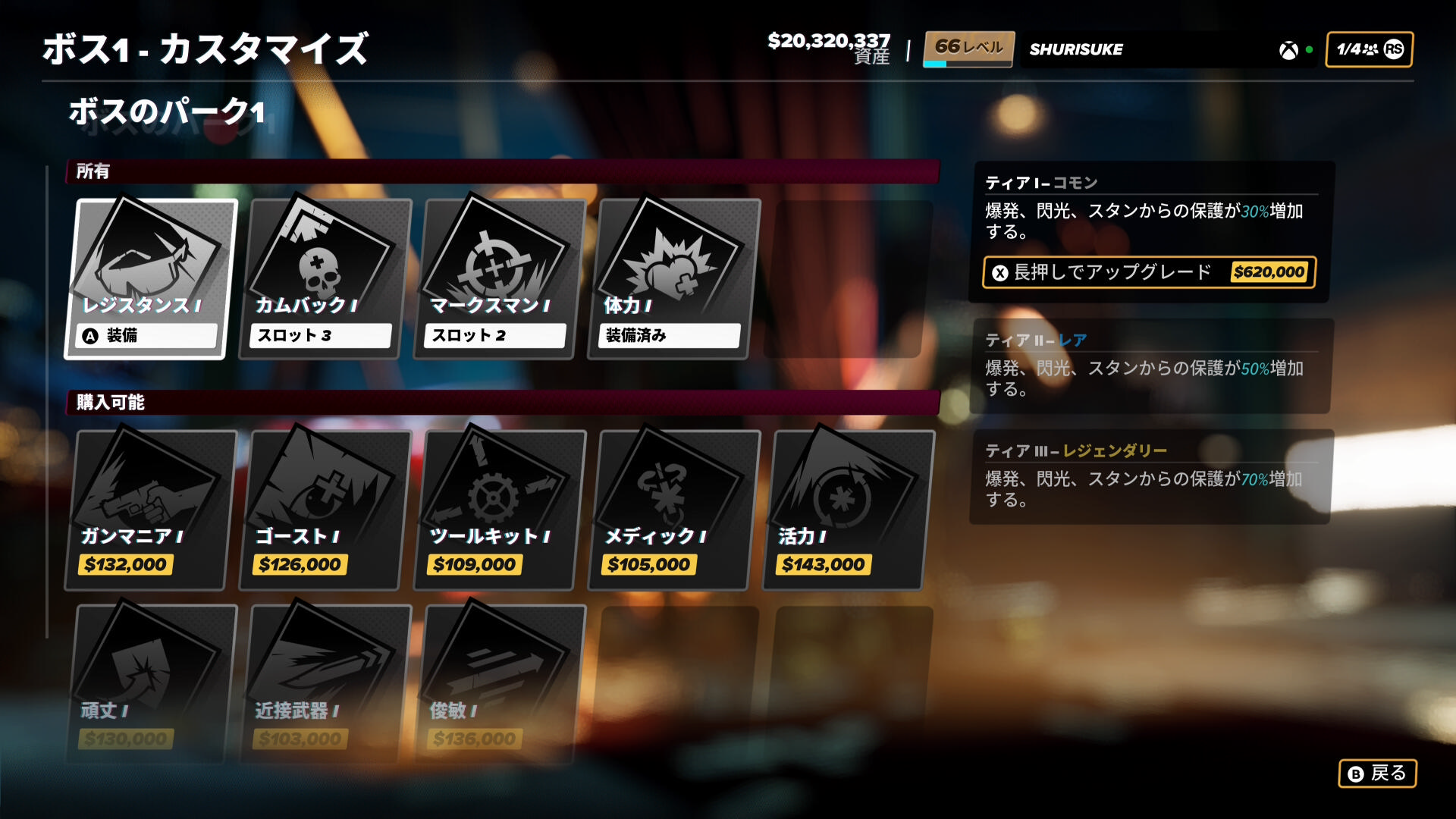 パークもいろいろと購入したり、装備を変えたり、アップグレードできます。ティア III までアップグレードが可能で、どのパークも魅力的で困っちゃいますね。