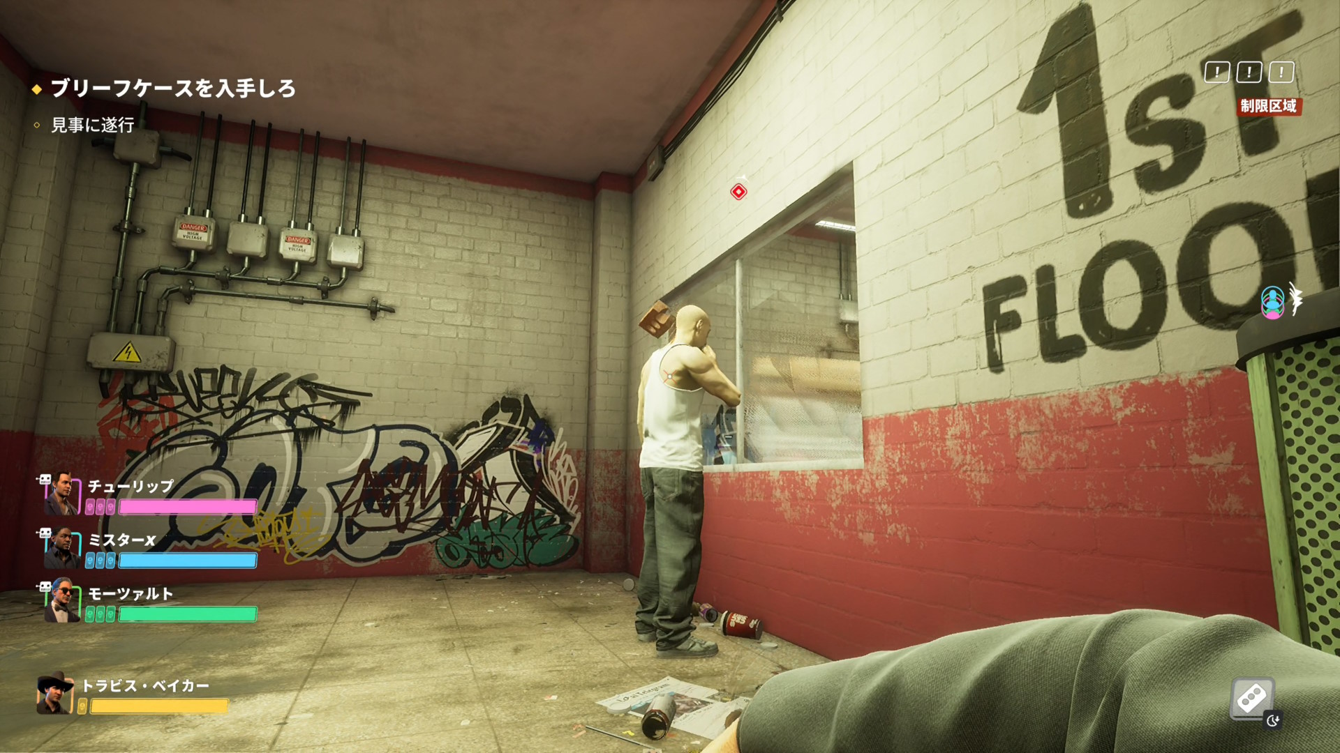 たまたま気づかれそうになったときに操作をミスってレンガを投げてしまったんですが、どうもこれでキルできるらしい、ということにここで気づきます。そして、警備員と一般人ではないのでキルしてもお咎めなしということにも気づきます。銃殺とは異なり、レンガキルは大きな音が出ないのでステルスが少しやりやすくなりました。