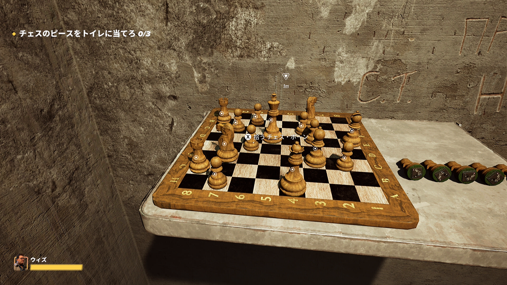 で、ウィズの視点でミッションが開始するわけですが、目標の ”チェスのピースをトイレに当てろ” の意味がよく理解できず。ピースはたくさんあり、決まったものを取ればいいのか、自由に取っていいのか、悩んでしまう管理人。