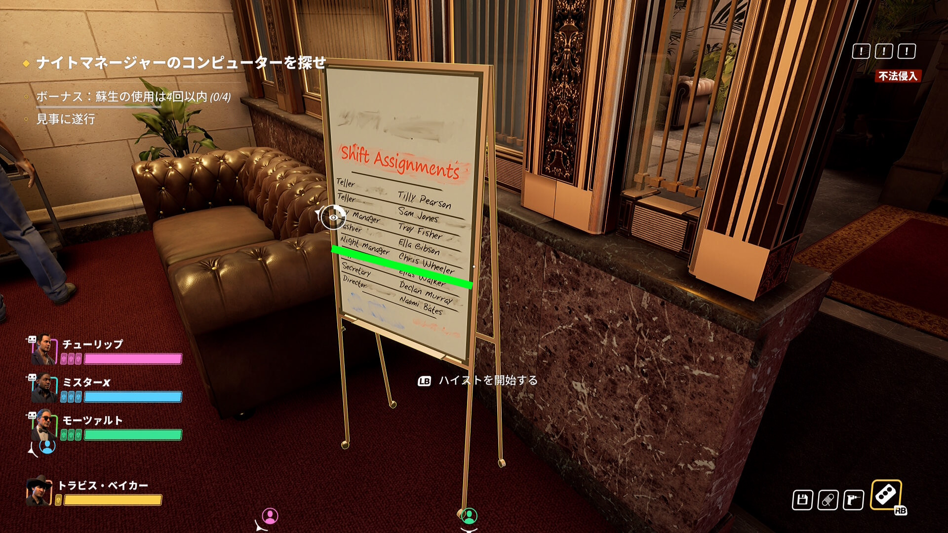 というわけで、隠し金庫があるとされる銀行にやってきた一行。まずはナイトマネージャーが誰なのかを突き止める必要があり、行内に置かれたシフト表を探します。