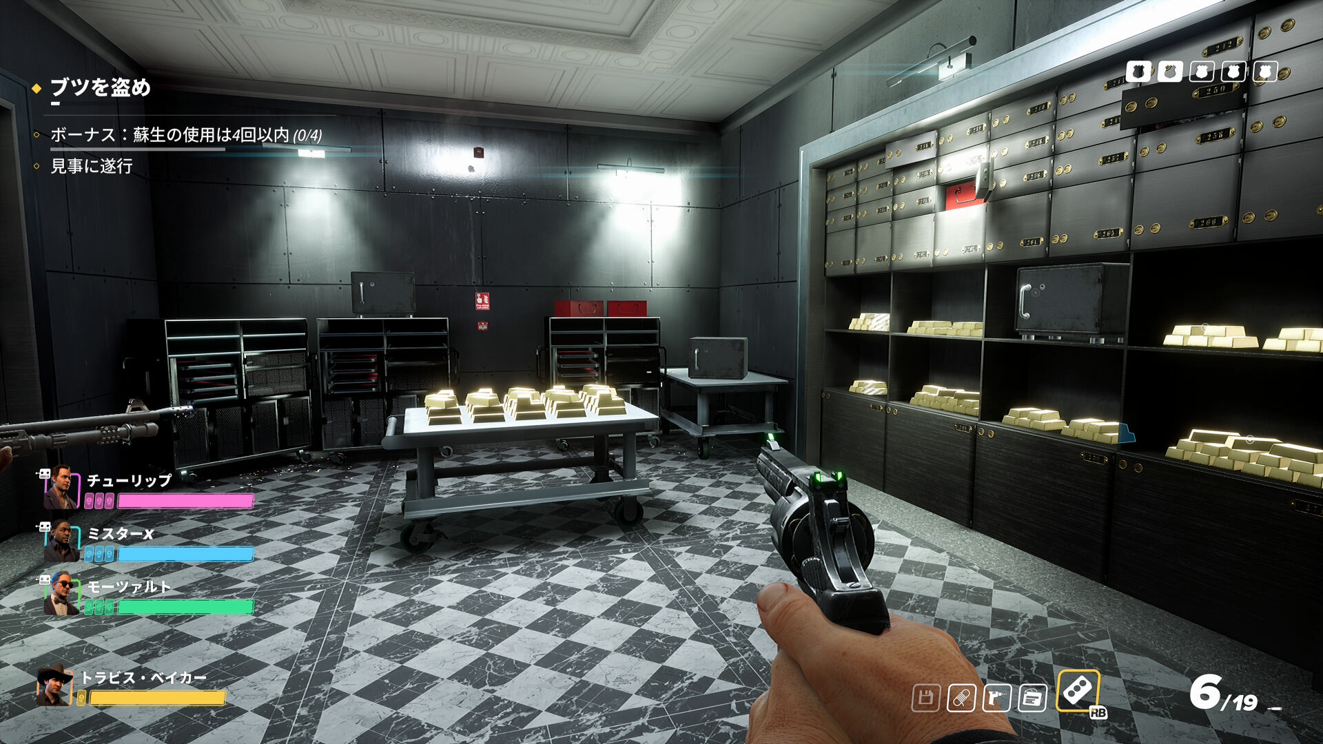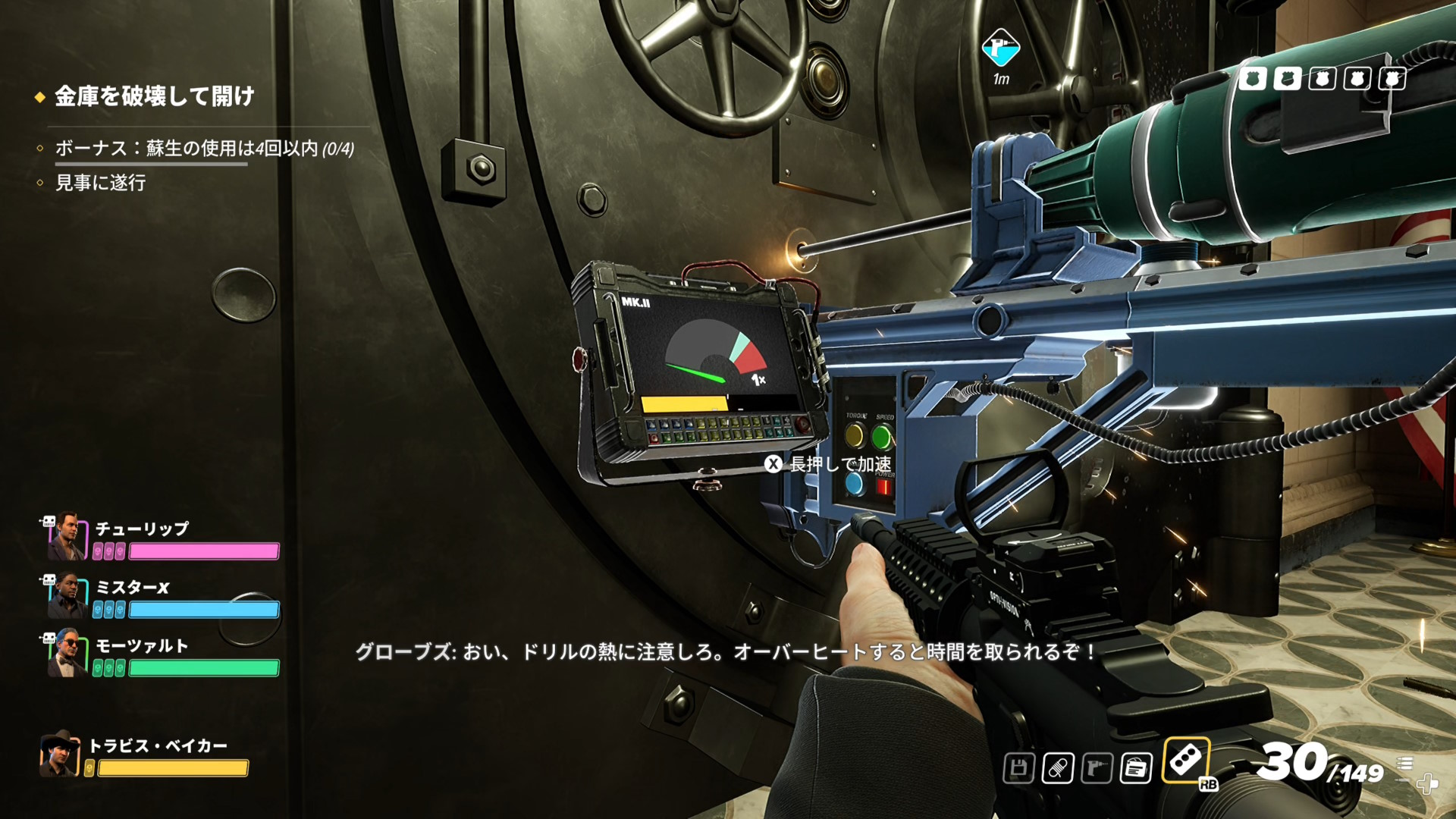 いきなり隠し金庫への道が開くものだから、行内は騒然&即警報発令。その中でいつものように金庫をドリルで開けていきます。ミッション前にドリルのアップグレードを依頼したのですが……正直、速くなった感はなく……残念。依頼しなかったらもっと遅いのかもしれないけど。