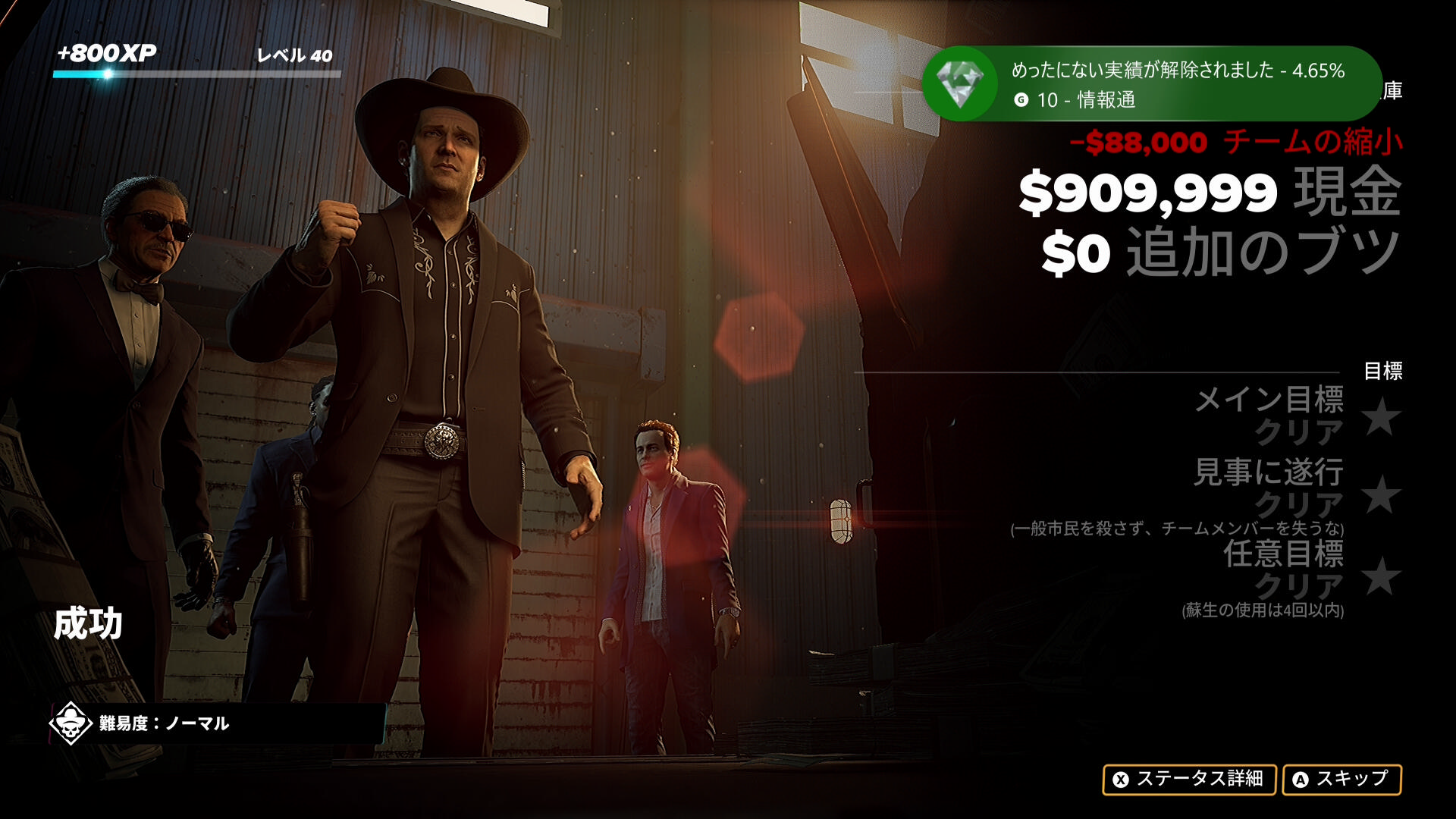 ちょうど組織レベルが上がった画面で実績解除。ドル・ドラゴンをロッケイシティから追放したという実績ですね。隠し金庫をクリアするのはなかなか神経を使うけど、こういうやり方でもドル・ドラゴンを追い出すことができるんだね。