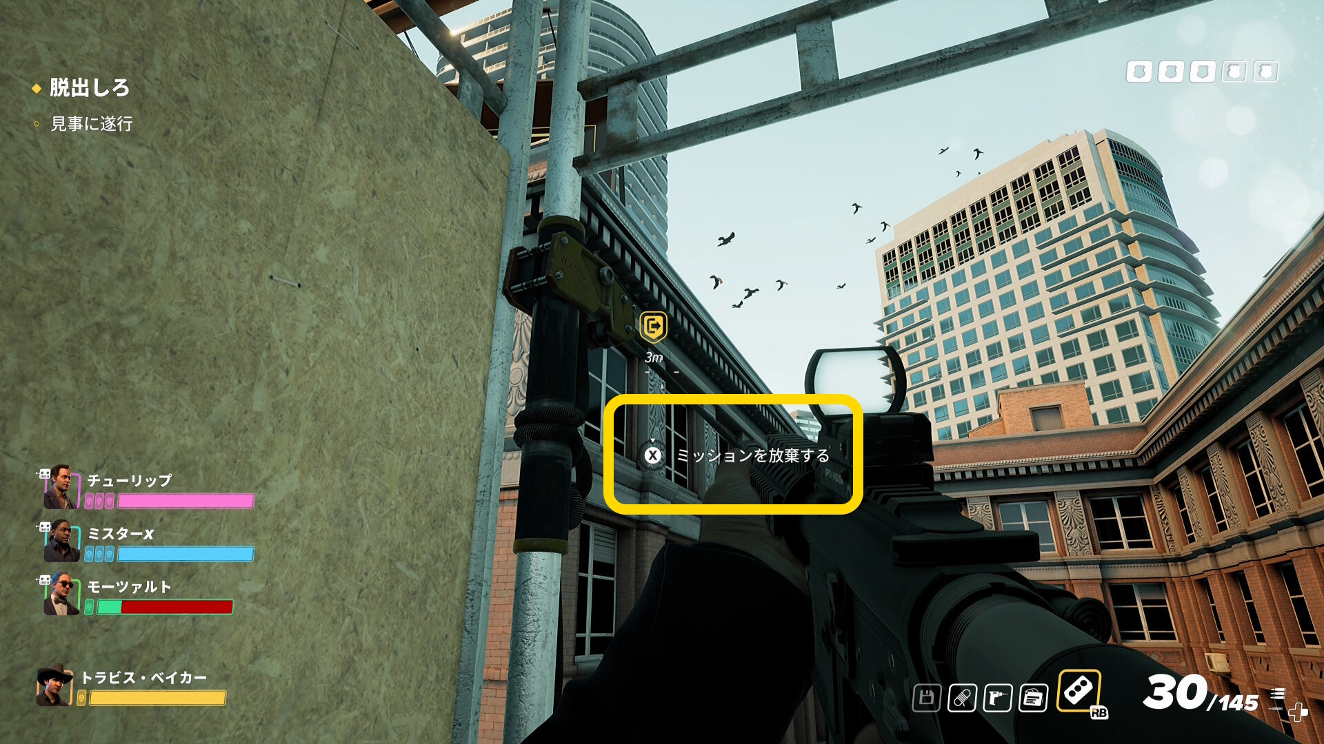 クリア後に海外ニキのプレイ動画を観たところ ”Leave the Mission” と表示があり、Leave を ”放棄” と訳しちゃったんだろうなあ。海外でも Abandon と Leave は使う場面が異なるらしいのでしょうがないっちゃしょうがないけどさ。
