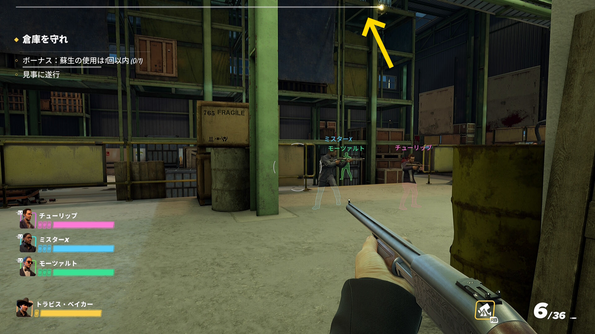 さっそく開始してみたところ、ベイカーたちが所有する倉庫を敵対するギャングが襲っているとのことで、その防衛戦となりました。画面上部にバーが表示され、時間とともにバーが短くなっていきます。つまり、バーが消えるまで防衛できれば勝ちってこと。