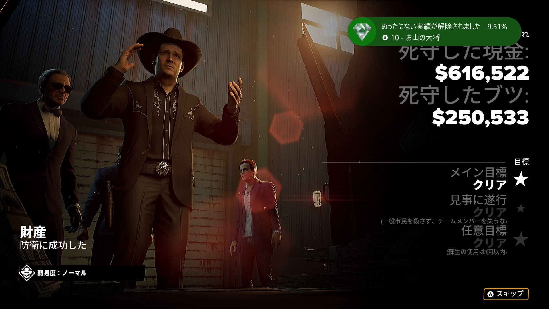 初めて倉庫の攻防戦を勝利したので実績解除。報酬が約 $100万くらいあって驚く。ランダム発生なので狙ってできるものではありませんが、防衛に2,3回成功すれば家具が1つ買えるなあと。