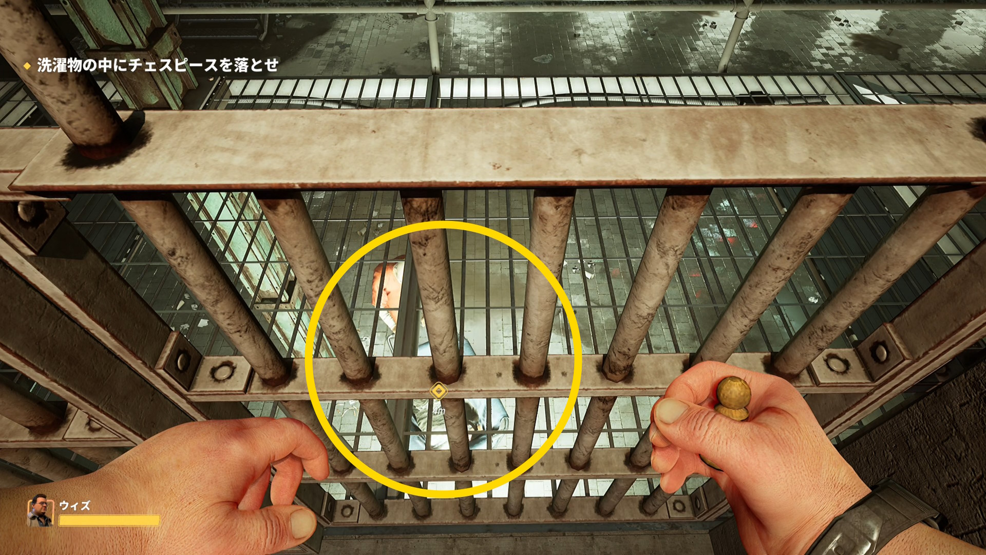 で、納得した服役囚はランドリーカートを動かす服役囚に指示を送り、ウィズは解読したデータが収まったブツをカートに投げ入れます。房の格子の隙間を通すように投げなくてはいけないので地味に難しかった。