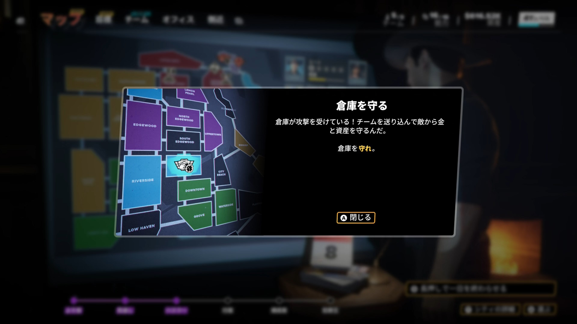 キャンペーンをリスタートしちゃってから気づいたので、次周では倉庫が襲われるのを待つのもいいかもしれない。まあ、その前に捜査が 100% なっちゃいそうだけど。ちなみに 100% になったら何が起こるかはまだ知りません。ゲームオーバーかな?