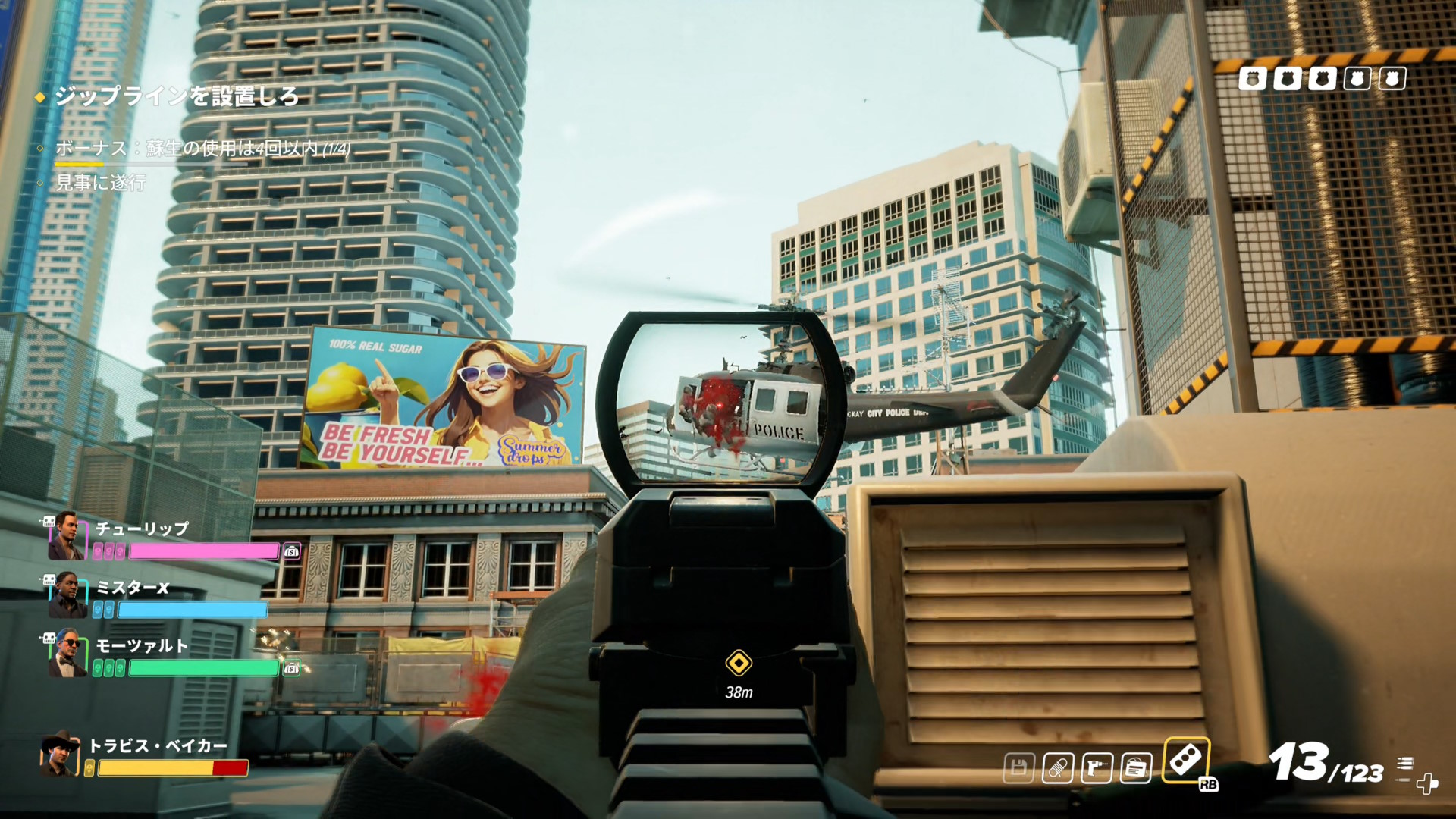 銀行の屋根(屋上)に到着。ジップラインを設置してバッグを運びつつ脱出するわけですが、とんでもない数の SWAT が集結してなかなか進めない。さすがの仲間もダウンすることが多くなり、かなり厳しい戦闘&緊迫感がすごい。