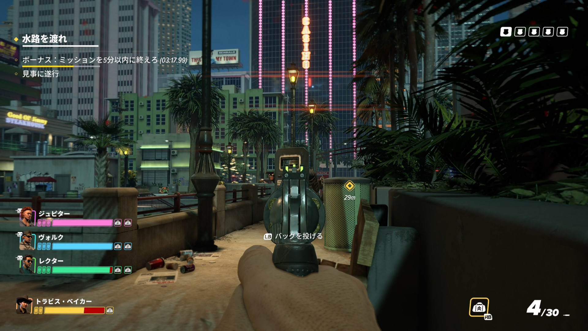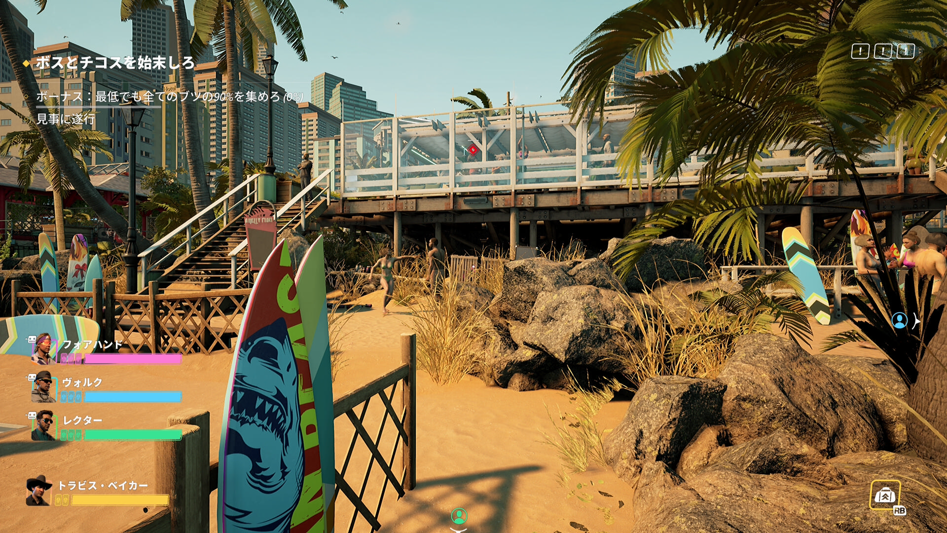 手始めに奪われたビーチのジムを奪い返しつつ、チコス(ヒエロの手下たちの総称)とそのボスを亡き者にしてやろうという作戦。最初のミッションですし、チコスらもベイカーたちが乗り込んでくるとは思っていないので手薄。楽勝で奪い返しました。
