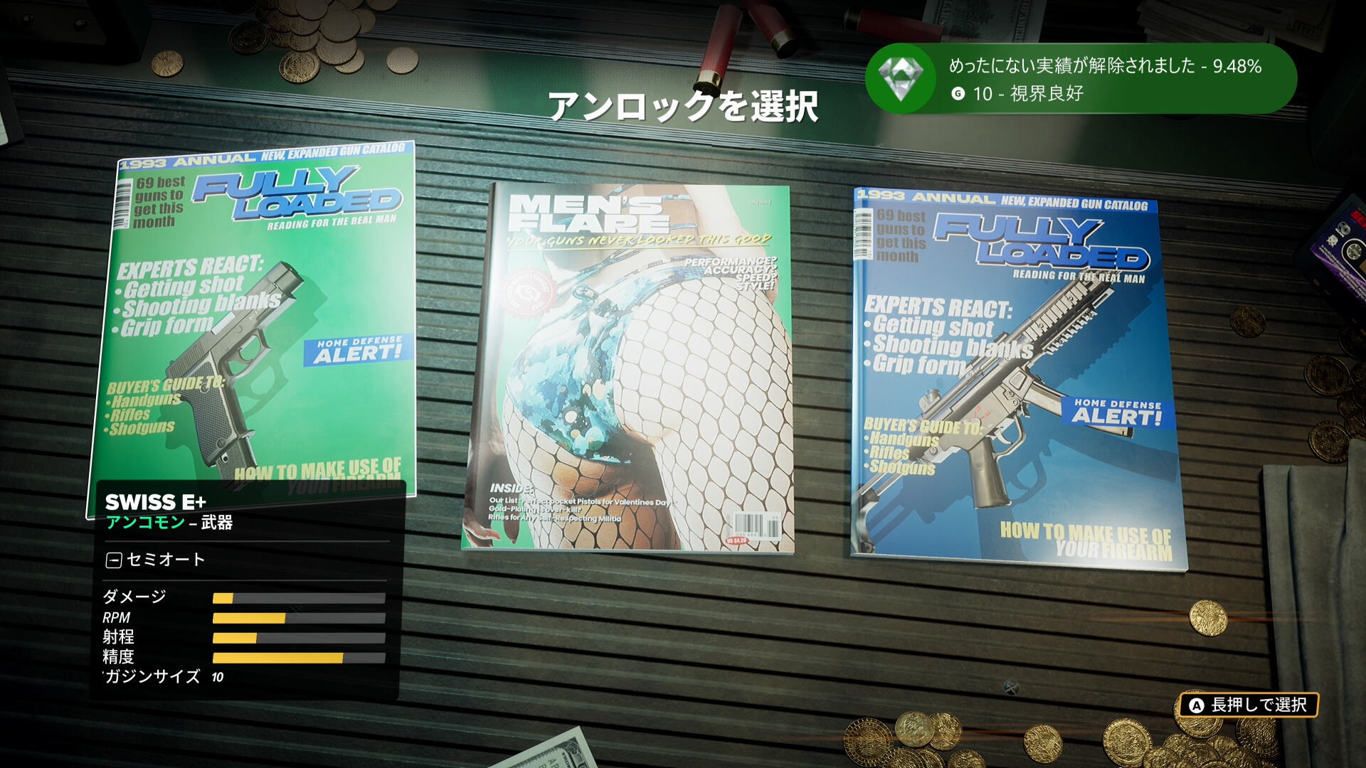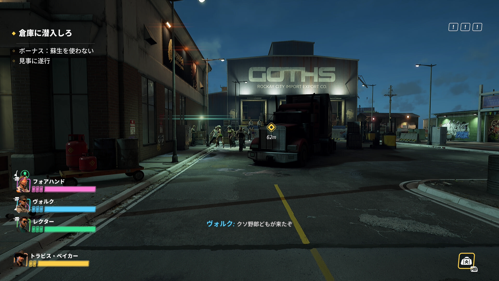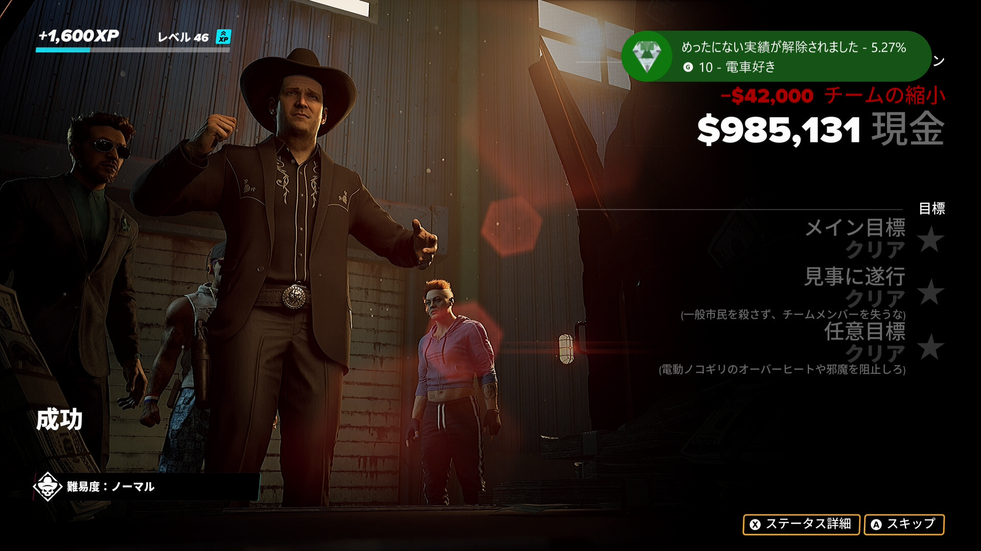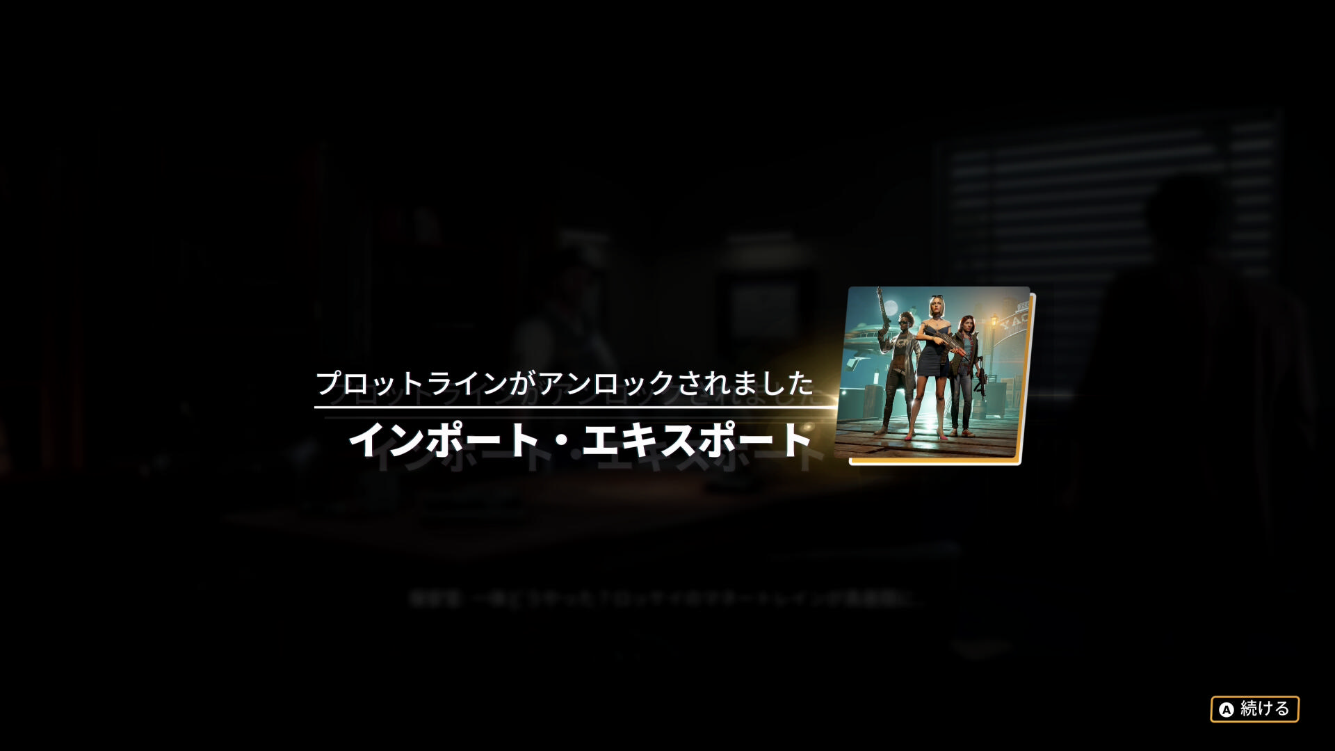 そして、最後、4つ目のミッション ”インポート・エクスポート” がアンロックされました。実績を確認すると大暴れしてクリアするものとステルスでクリアするものがありました。2つの実績は相反する内容なので2回クリアは確定ですね。ステルスがめちゃくちゃ難しそうなんだけど、ちょっと楽しみでもあります。
