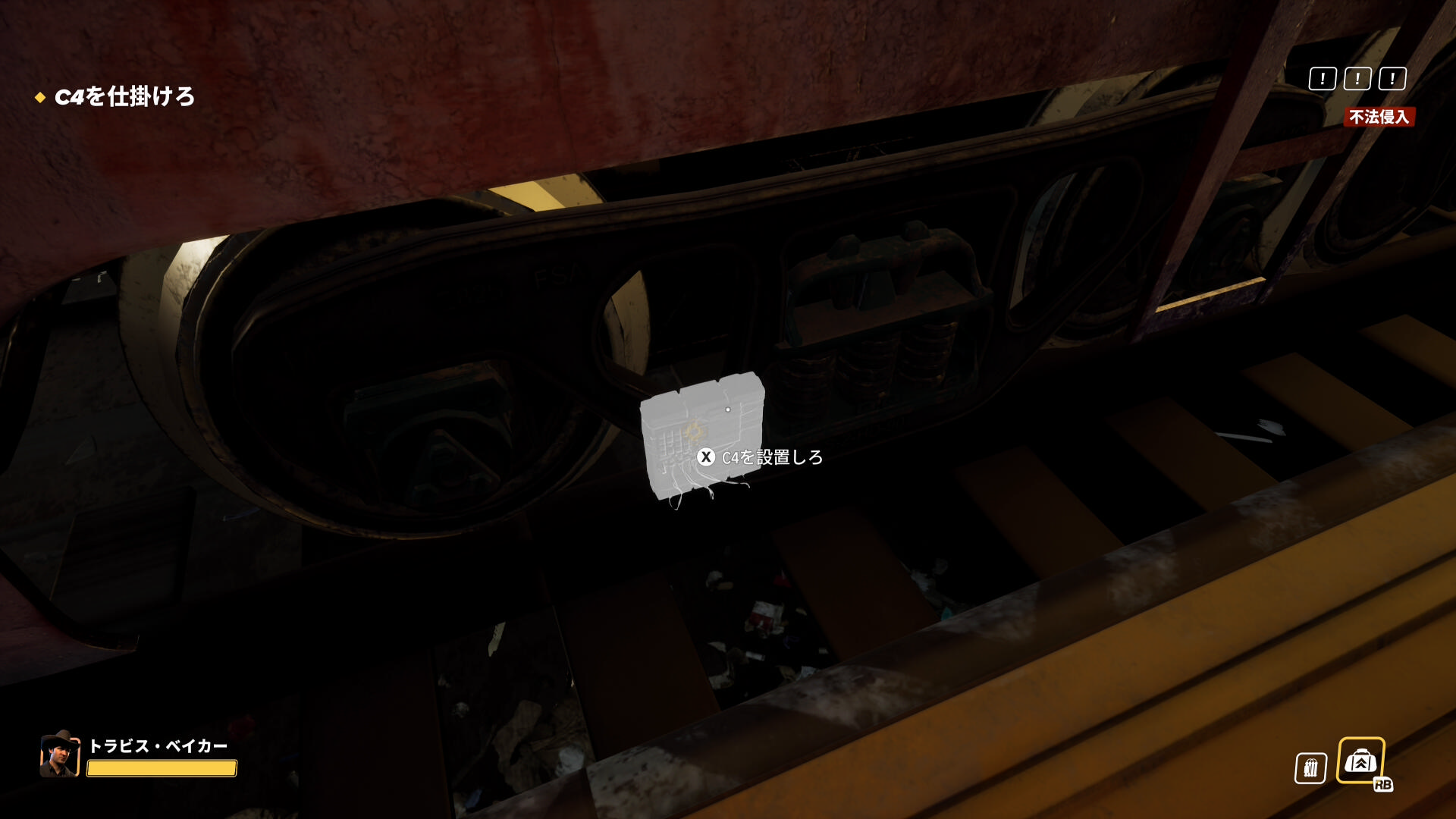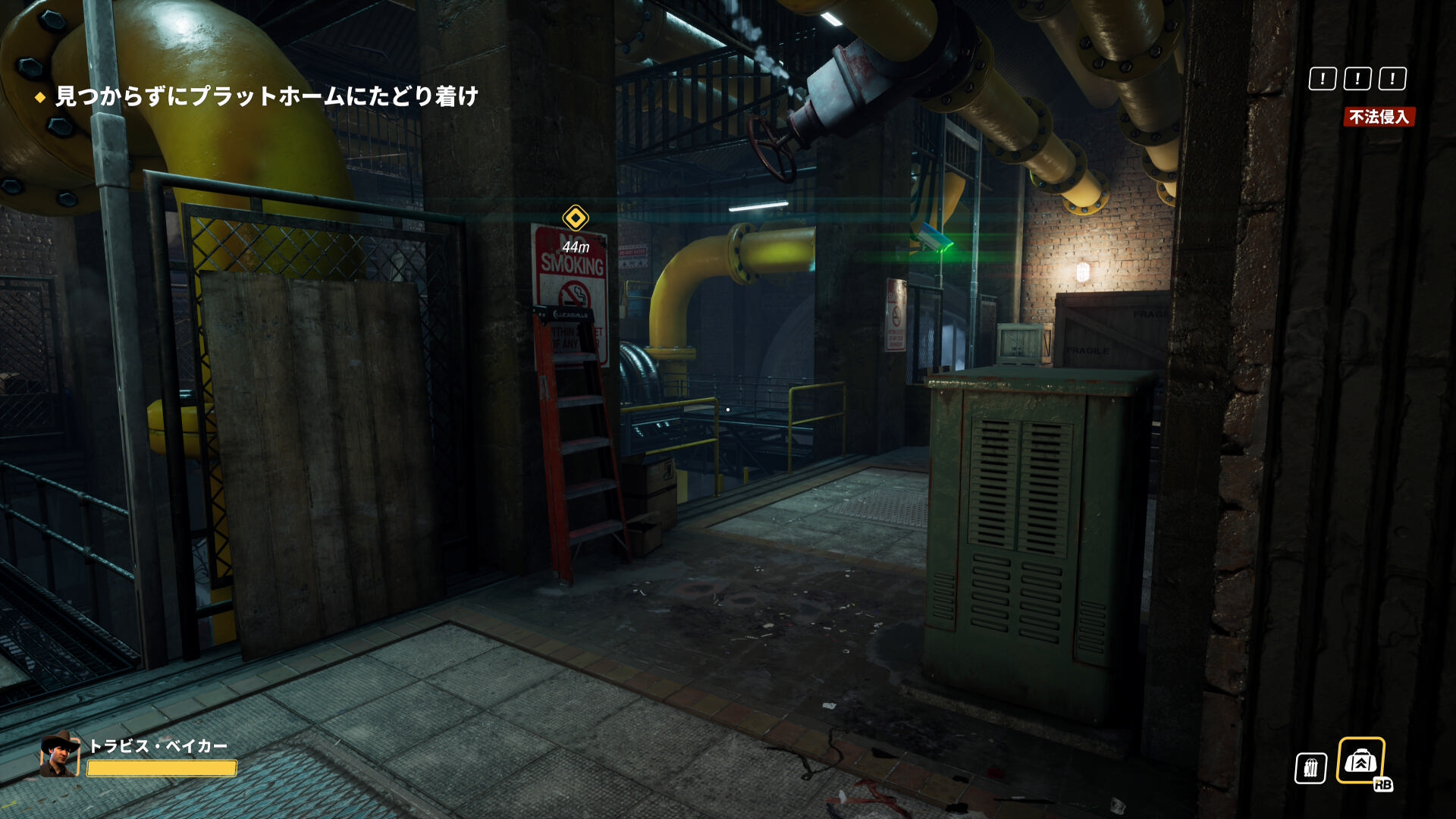 まずは列車を動かなくする必要があるので、列車に C4 爆弾を仕掛けに来たベイカー。列車の整備場に忍び込んだものの、監視カメラや警備員、作業員がいるので地味に難しかった。