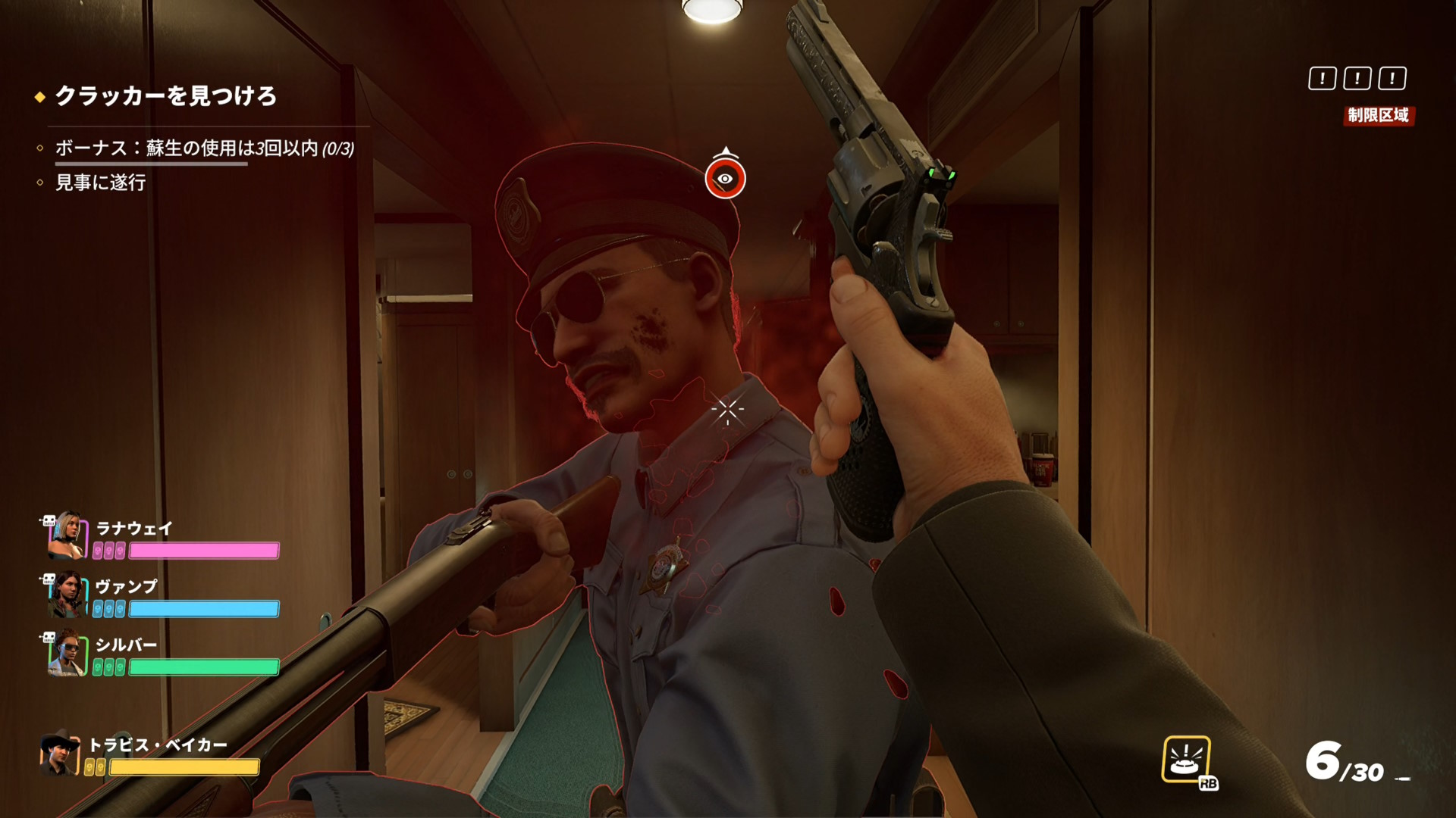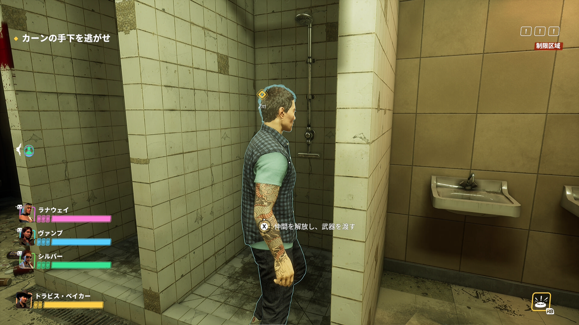ボートを探索している途中、どうしても拘束が間に合わず撲殺した警察官がおりまして。すると画面右上の「!」マークが1個点灯します。広義でいえば、「!」マークが1個点灯したことも ”アラートとして判定される” ということのようです。