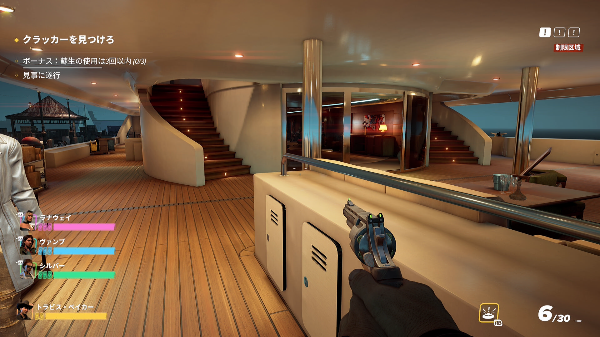 次のミッションはカーンの豪華ボートに乗り込んで積荷を強奪する内容。ボートの停泊所までは多数の警察官が巡回していたり、ゲートが施錠されていたりと手を焼きます。