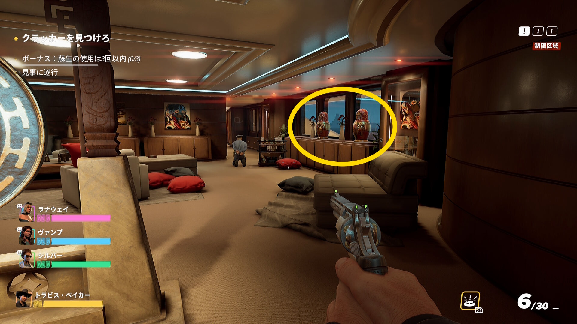 クラッカーは裸で置いてあるものだけではなく、マトリョーシカやカーンの胸像の中に隠されていたりして探索にも時間がかかる。確実性を高めるあまり、警察官を拘束して……などと、あまりゆっくりやっていると刑事が到着して警報が発令されてしまうし、難しい。