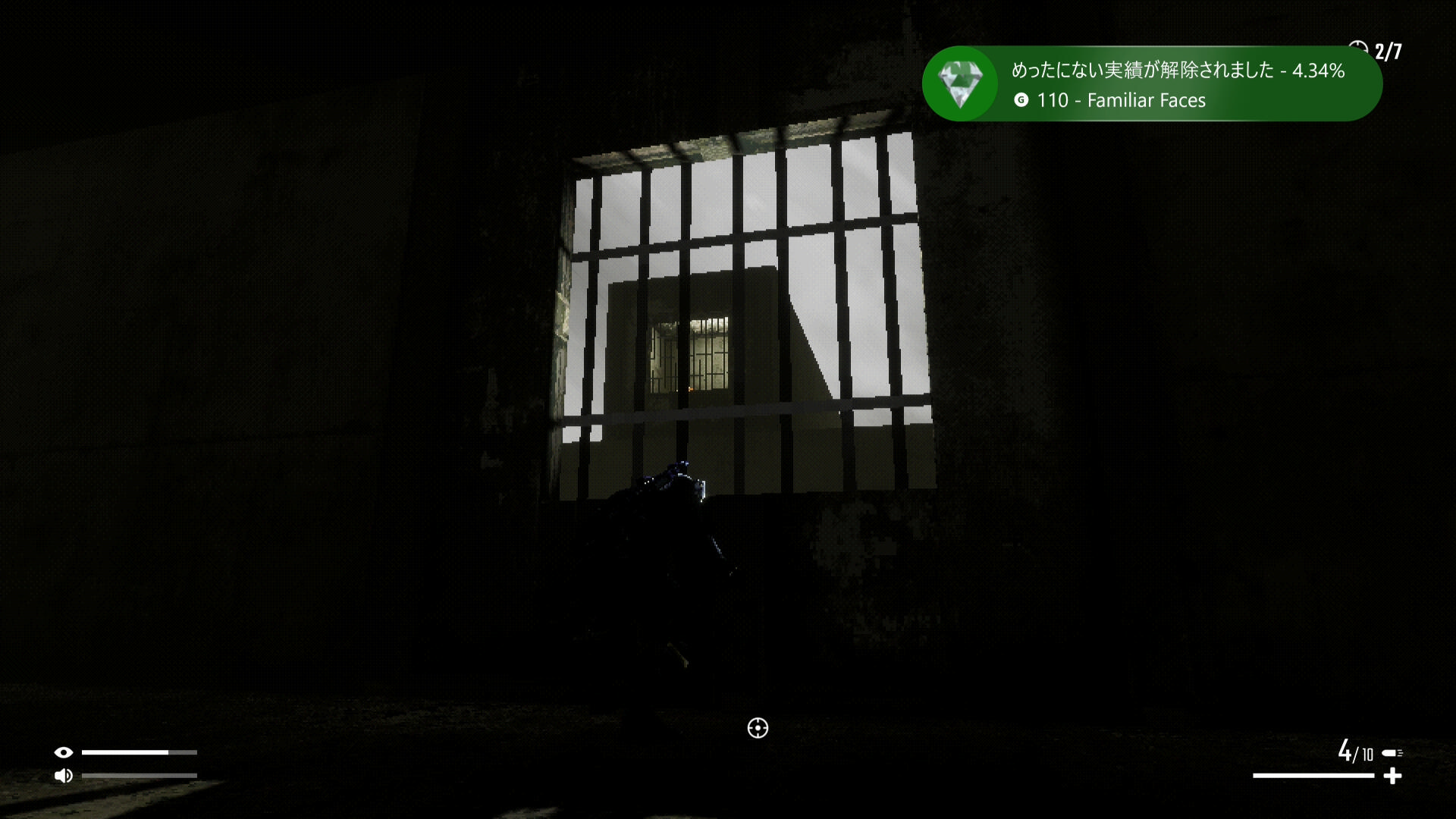 本作唯一のイースターエッグ実績を解除。格子窓から外を見ると向こう側の上層階に誰かいるんですね。それをズームで確認するとポコン来ます。