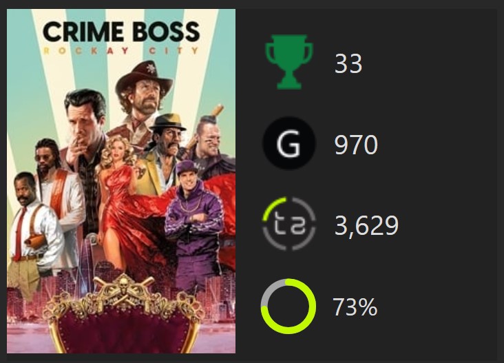 9月から継続プレイをしている Crime Boss: Rockay City。プレイ日記は滞っておりますが、昨日ギリギリで実績コンプできました~。雪が降るころ、もしくは今年中に実績コンプできればと、ゆるい気持ちで臨んでいたこともあり、終わってみれば予想よりかなり早いゴールとなりました。