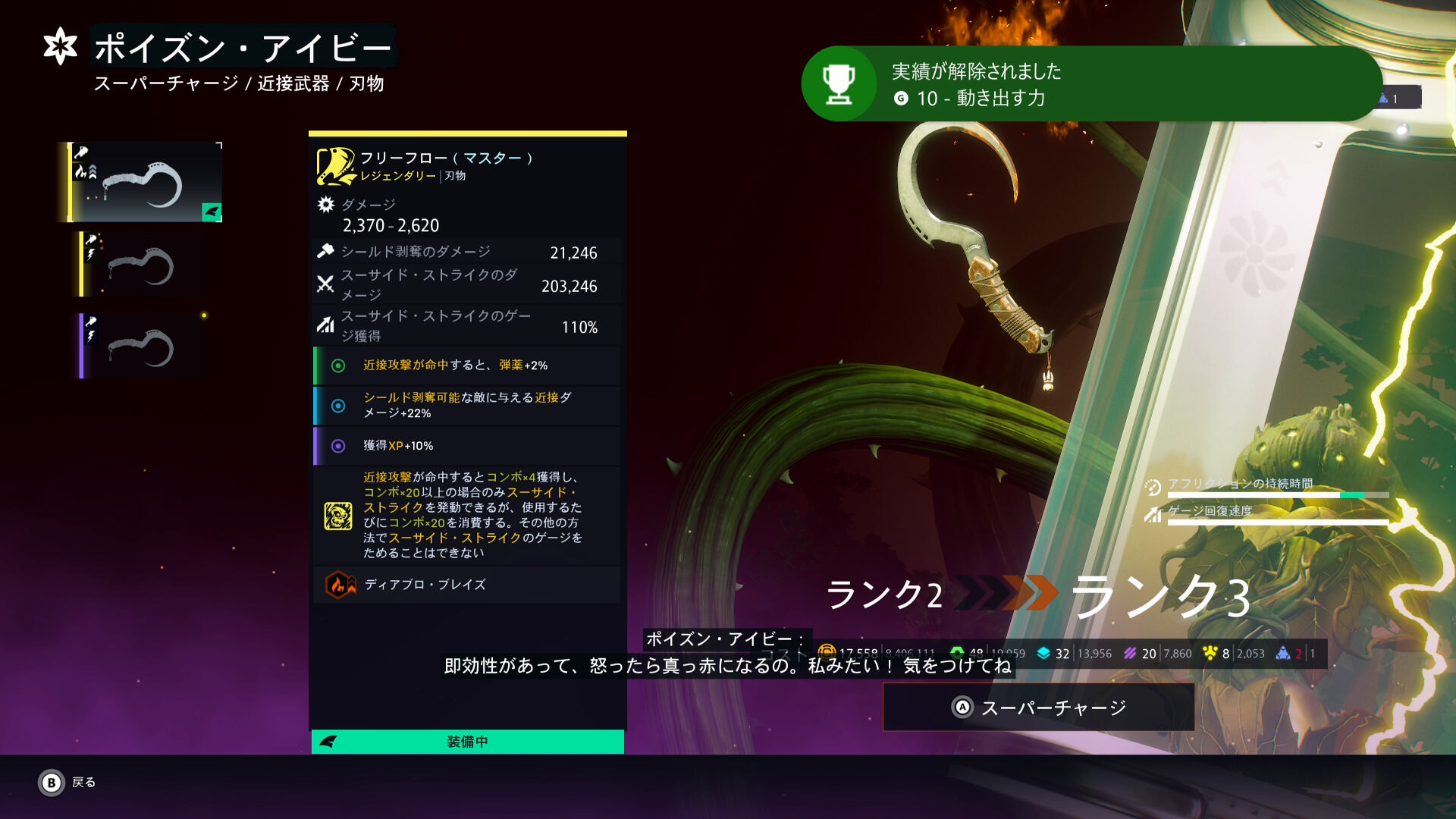 クリア報酬として「スーパーチャージ」がアンロック。さっそく彼女の工房に戻り、選べるようになったスーパーチャージを依頼します。