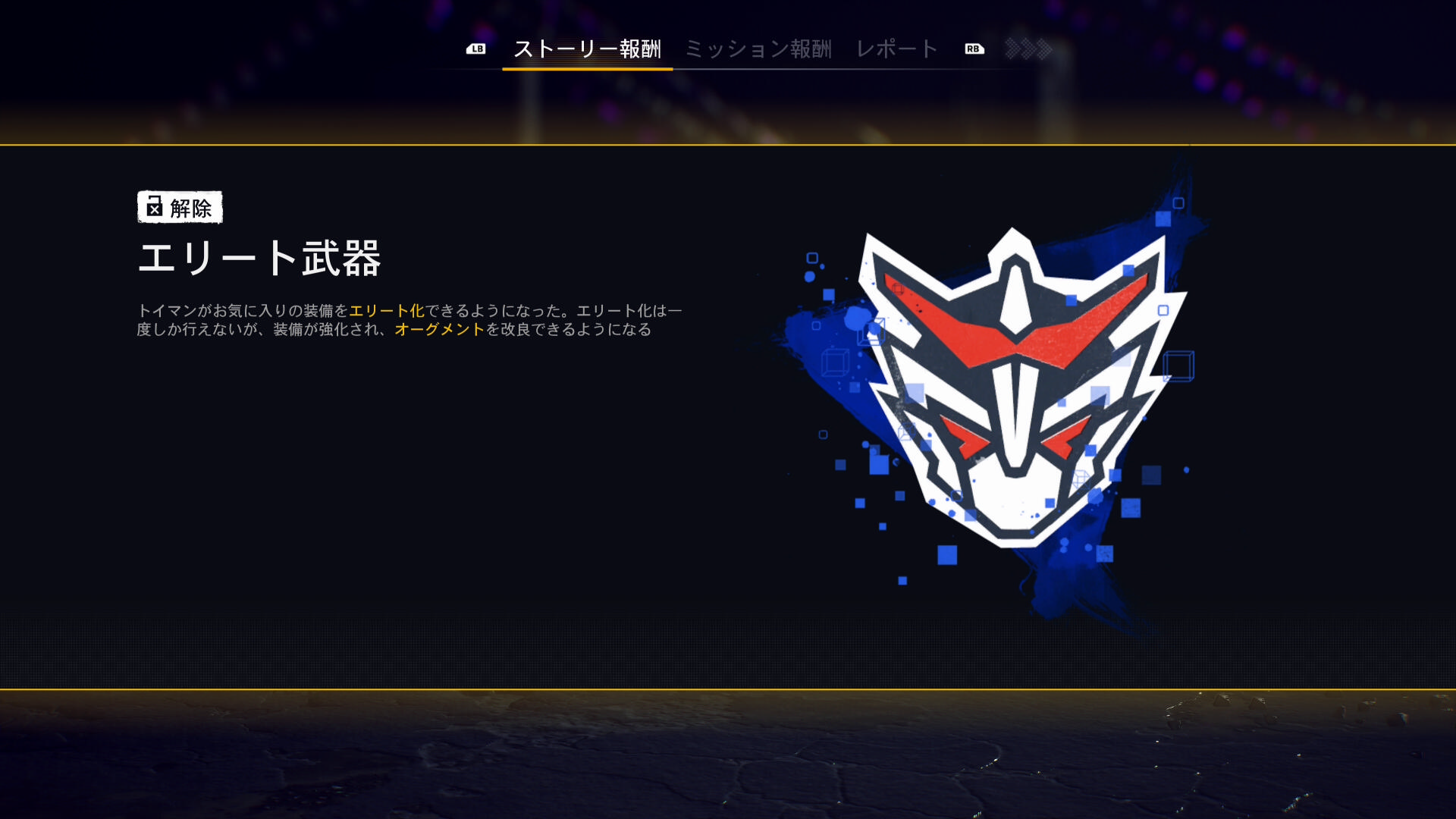 トイマンのサポートスクワッドミッションを全クリすると「エリート武器」がアンロック。これは好きな装備をエリート化できるオプションみたいです。どのくらい強くなるのか楽しみ!