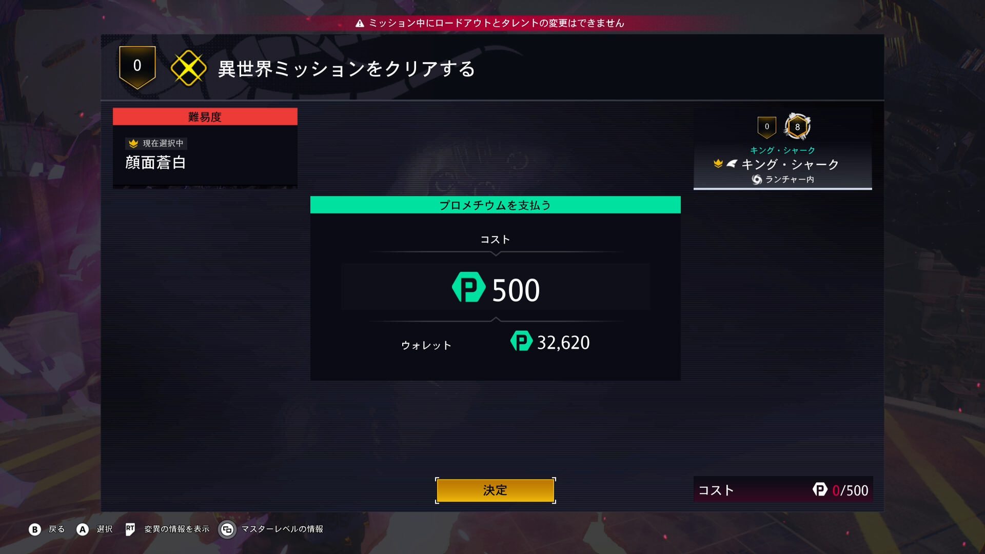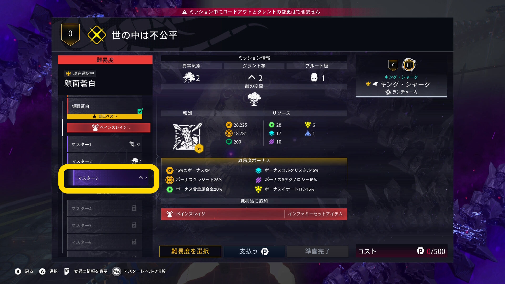 先ほどアンロックされたマスターレベルです。ミッション開始前に難易度を選ぶことが可能になります。思い切って現状選択できる最大のレベル ”マスター3” を選んでみました。