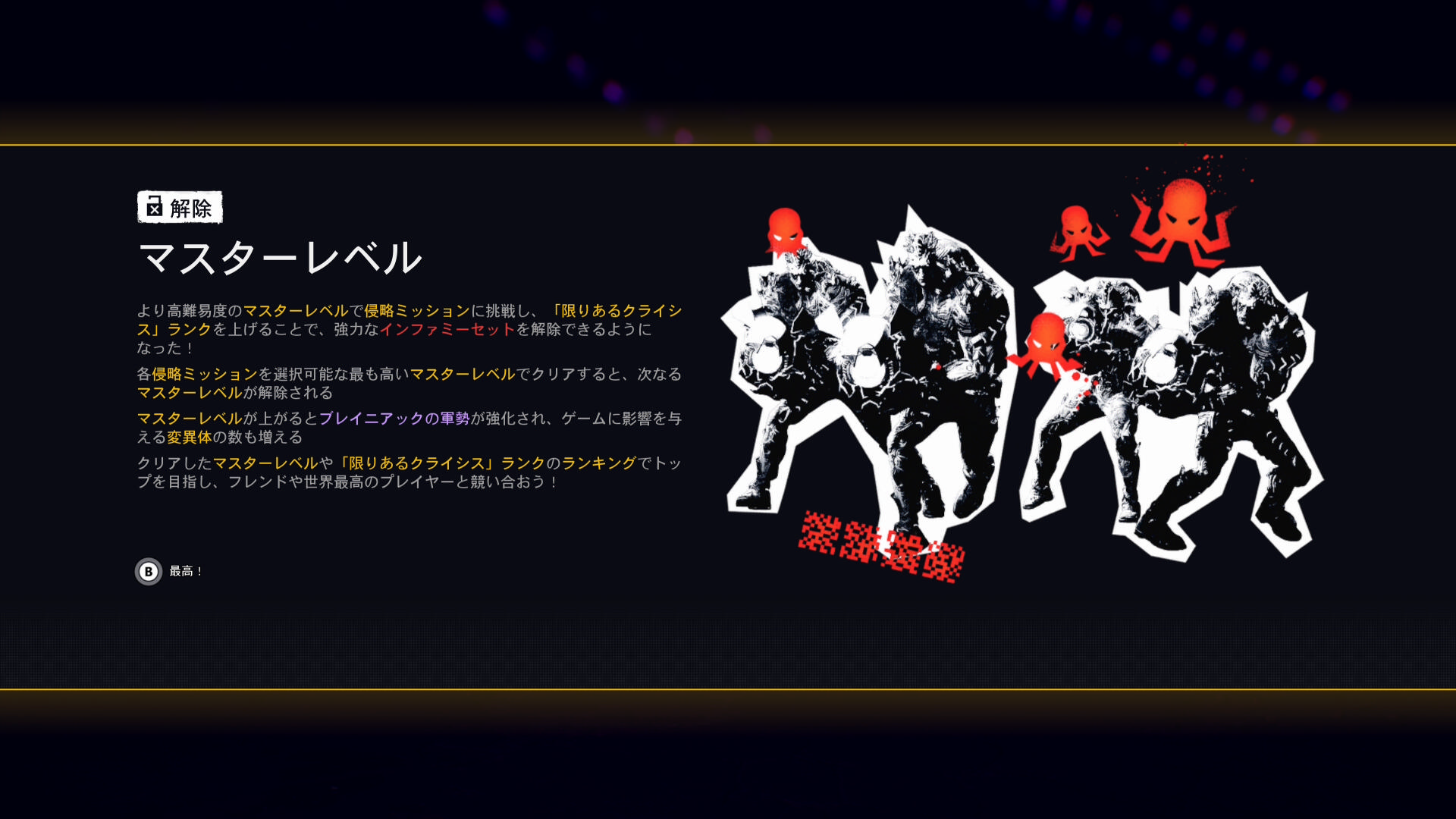 3個の侵略ミッションをクリアするとマスターレベルがアンロックされました。これにより、より高難易度のミッションをプレイできることになり、さらに戦闘は激化していくのでしょう。不安しかない。