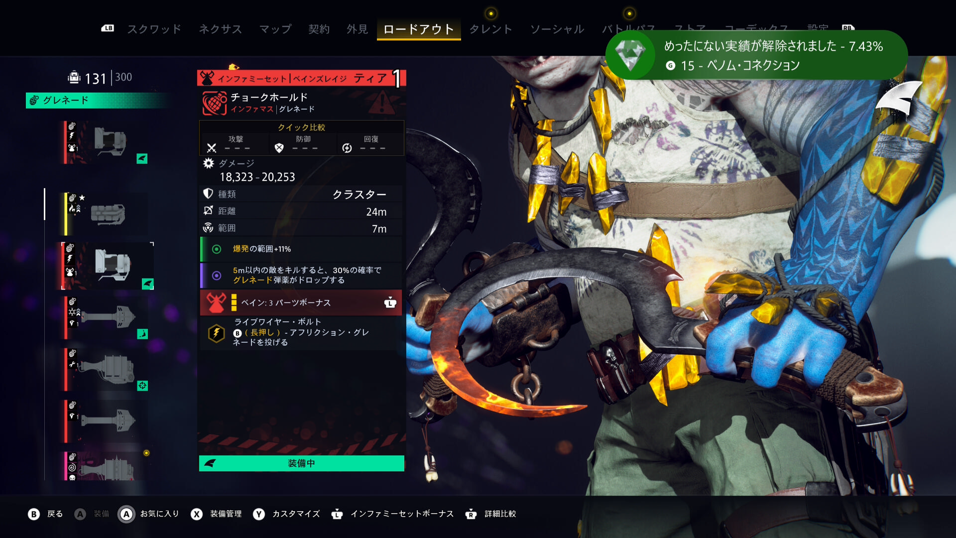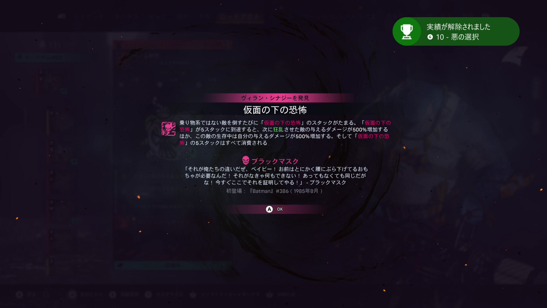 解除条件は『ヴィラン・シナジーを解除する』というものですが、いまいち理解できず。海外サイトを調べてみたところ、ノートリアス装備とインファミーセット(ベインズレイジ)を同一のキャラクターに装備させることでヴィラン・シナジーなるものがアンロックされると。