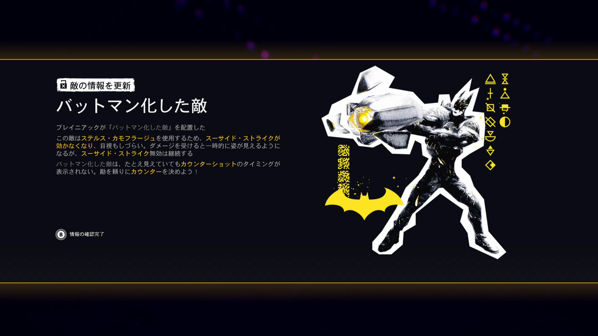 ミッションを進めていくとバットマン化した敵が出現するようになります。ステルス・カモフラージュを使うので、くっきりと視認できません。