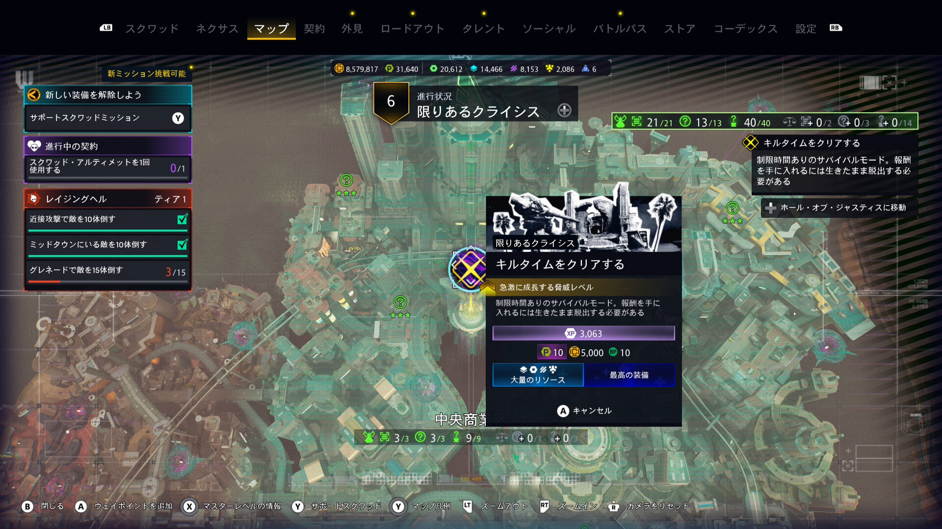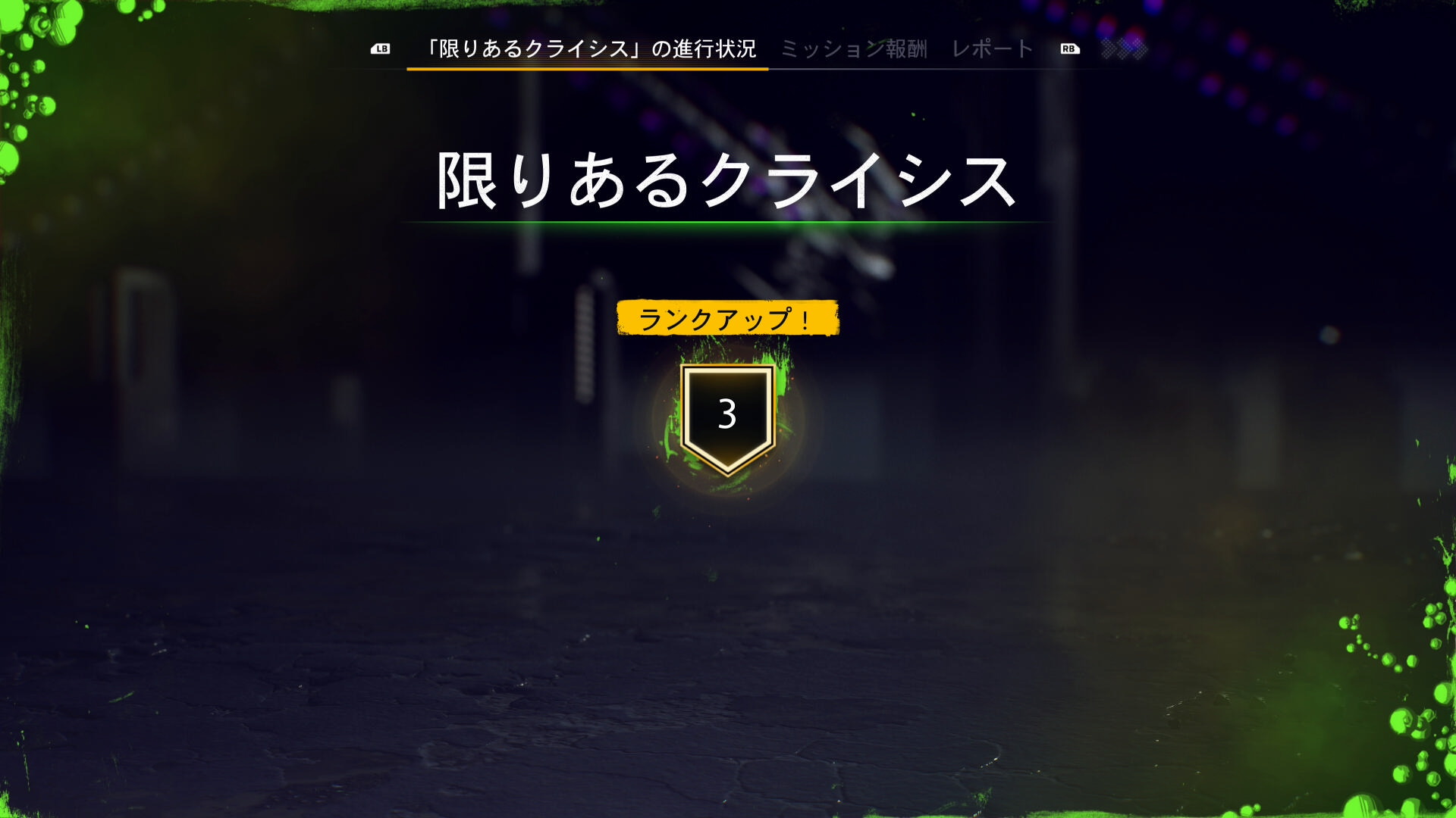そして、「限りあるクライシスランクレベル」も3に上がりました。おそらく、選択したマスターレベルとリンクしているようです。次のミッションもマスター3でクリアしたところ、ランクレベル6になりましたので間違いないかと。