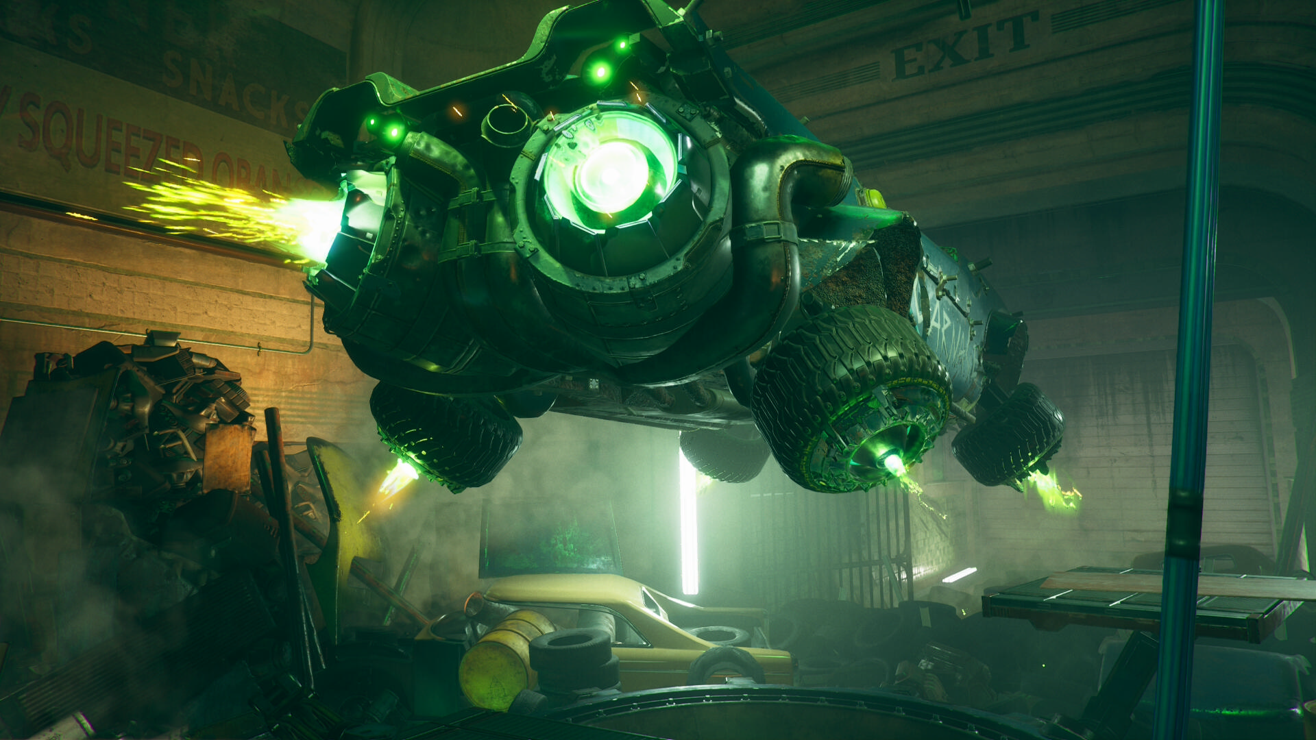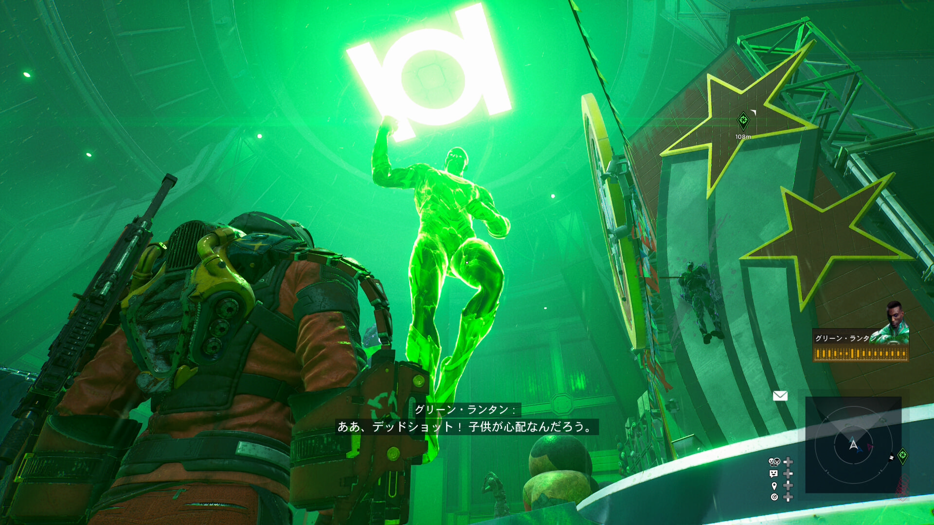 スタジアムから出ようとすると壁や天井が緑色になって、突然ダメージを受ける壁になってしまった。どうしようかとウロウロしていたらグリーン・ランタン(巨大)が登場。