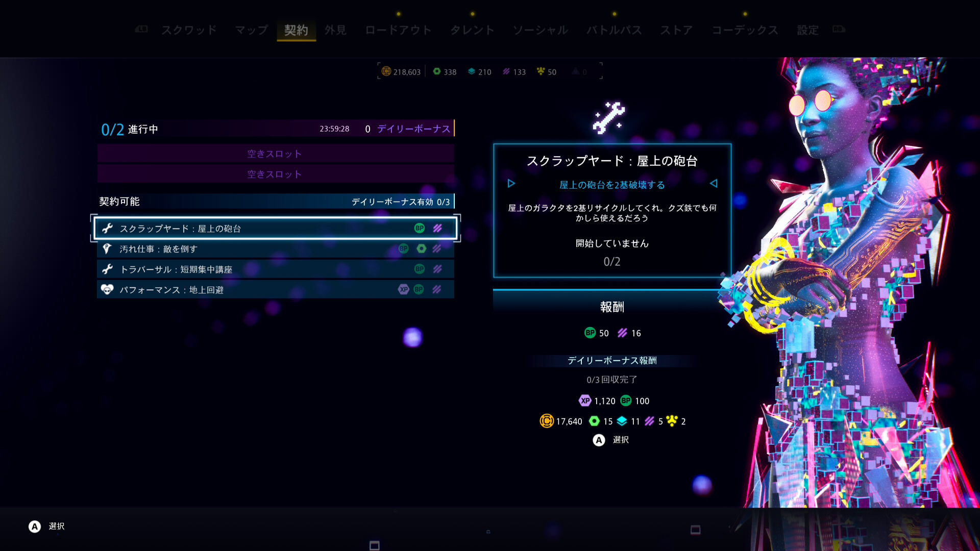 『屋上の砲台を2台破壊しろ』『回避を5回しろ』などの条件が課されており、これをクリアすることでバトルポイントや経験値、リソースがもらえるというもの。敵は基本的に無限湧きなので、行く先々で戦闘になった際、契約を受諾しておけばついでにクリアできたときに色々もらえるので一石二鳥です。