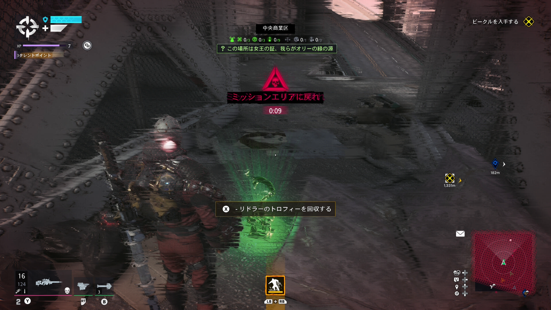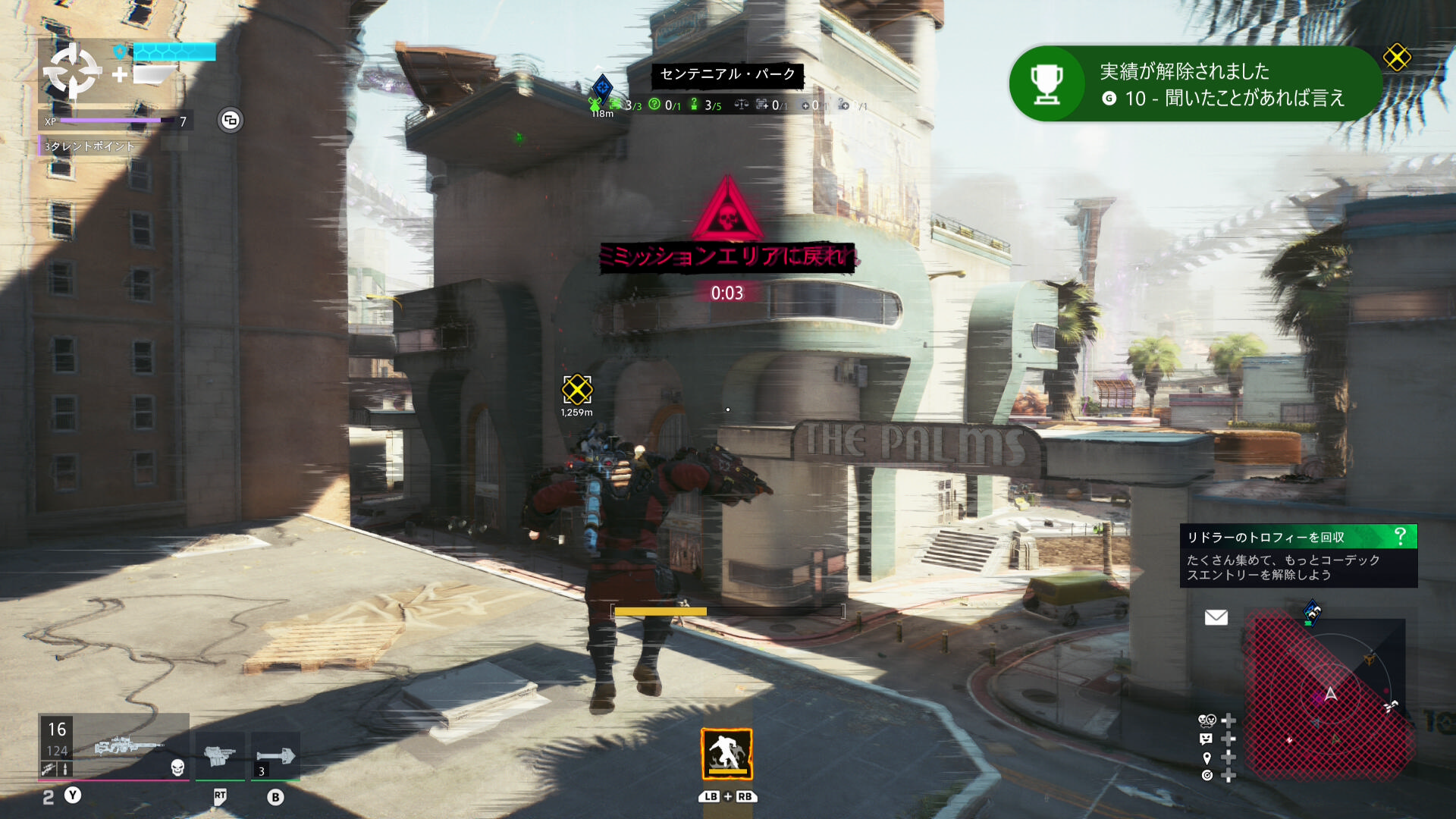ナゾナゾとトロフィーの回収は続く。たまたま見つけたトロフィーは立入禁止区域にあって。ちょっと無理して回収に向かいましたが、10秒のカウントダウンが始まって、それがゼロになると脳のナノ爆弾が爆発するので急いで戻ります。こえー。