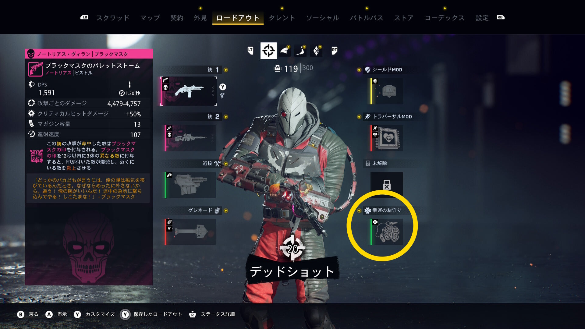 デッドショットがレベル20になったようで、右下のスロットがアンロックされたということらしい。四つ葉のクローバーを自動装備しており、クレジットの拾得量が +1% だそうです。