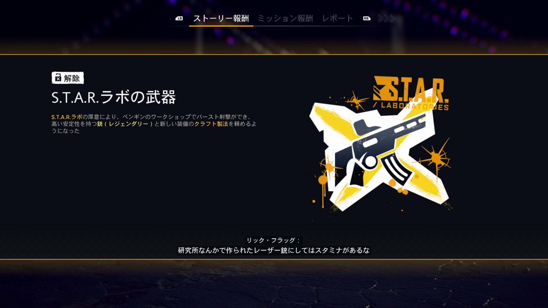 報酬は S.T.A.R. ラボの武器をペンギンに作ってもらえるようになるらしい。これも望み薄の中で期待する感じですかね。