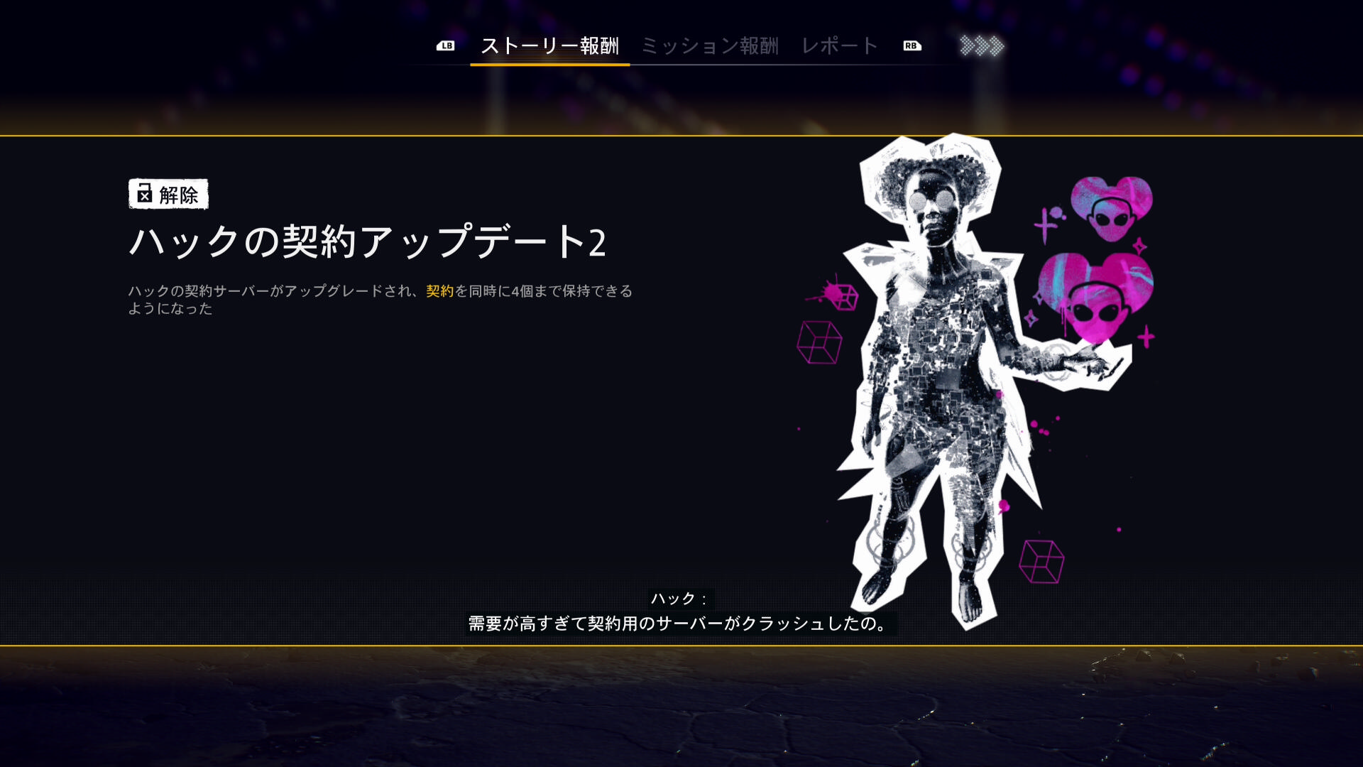 ただねー、契約については ”ちょっと厳しい(やりたくない)” 内容のものが多くなっていて、進捗率が停滞しがちです。最初は簡単なものが多かったんですよ。敵を20体倒すとか、屋上の砲台を4台破壊するとか。