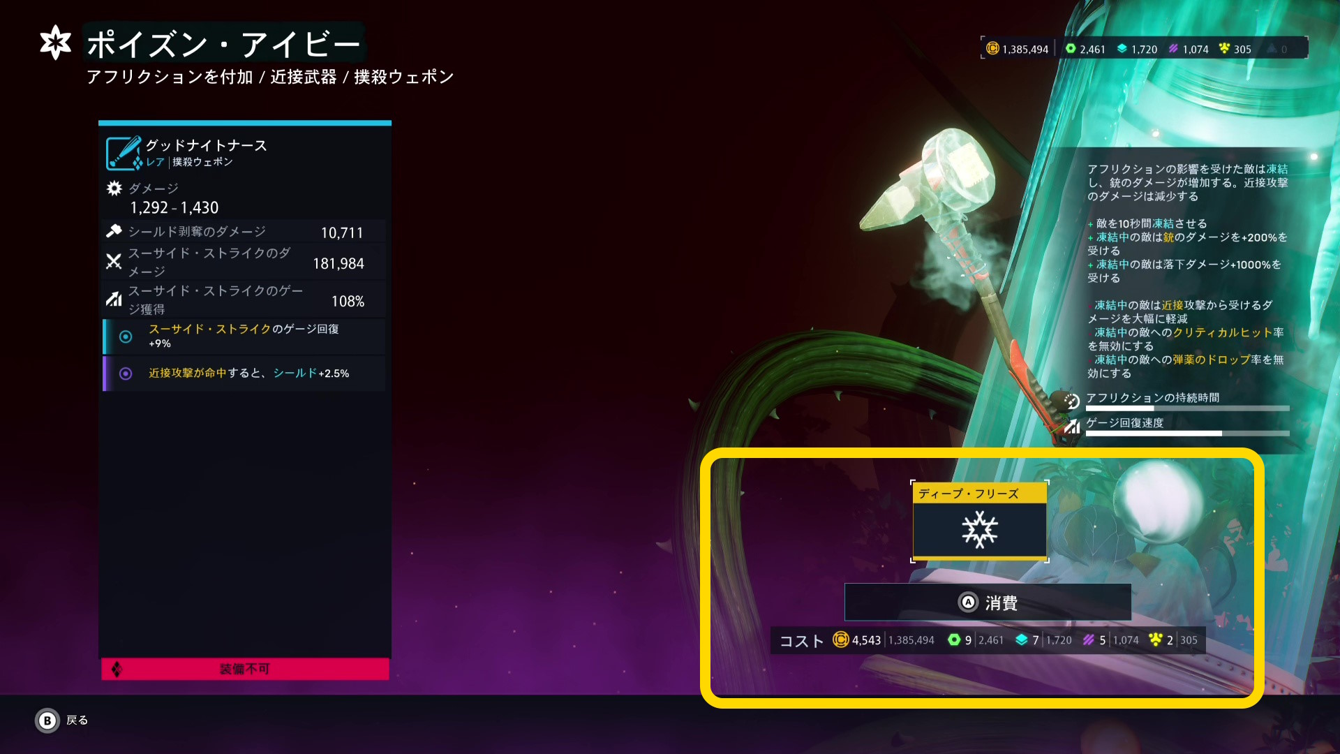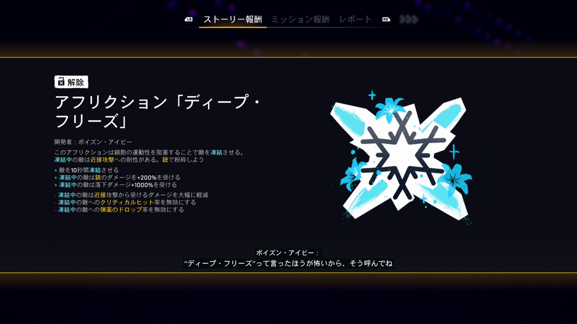 アフリクションという機能の内、ディープ・フリーズというものがアンロック。近接武器に付加させることで敵を凍らせる効果があるみたい。