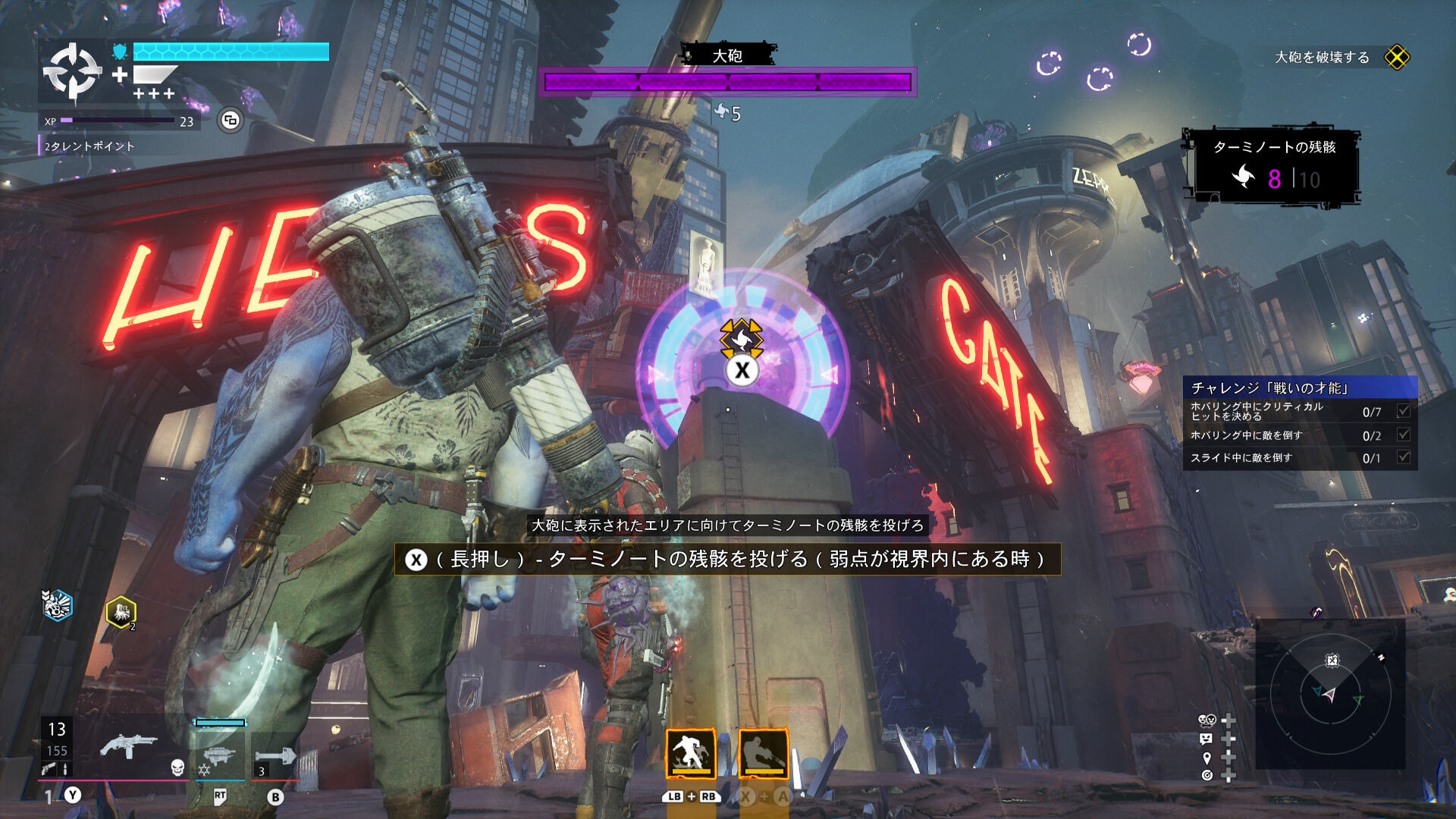 つーわけで戦闘開始。いきなり大砲にダメージを与えることはできず、敵を倒し、ターミノートの残骸を集めて弱点に投げ込み、そして露出した弱点を破壊する、という面倒な手続きを踏まないとベヒーモスにダメージを与えることができません。