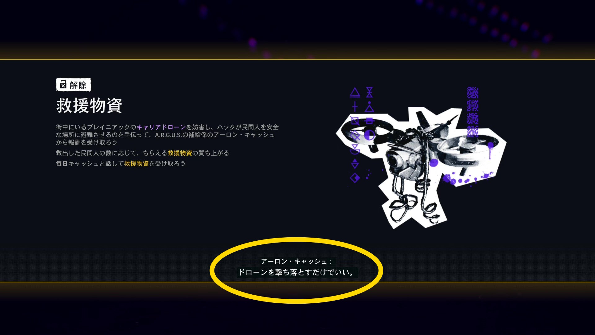 ホール・オブ・ジャスティスにキャッシュという人物(警察官)がおりまして、彼から『救援物資をあげるから人さらいのドローンを破壊してくれ』とお願いされる。