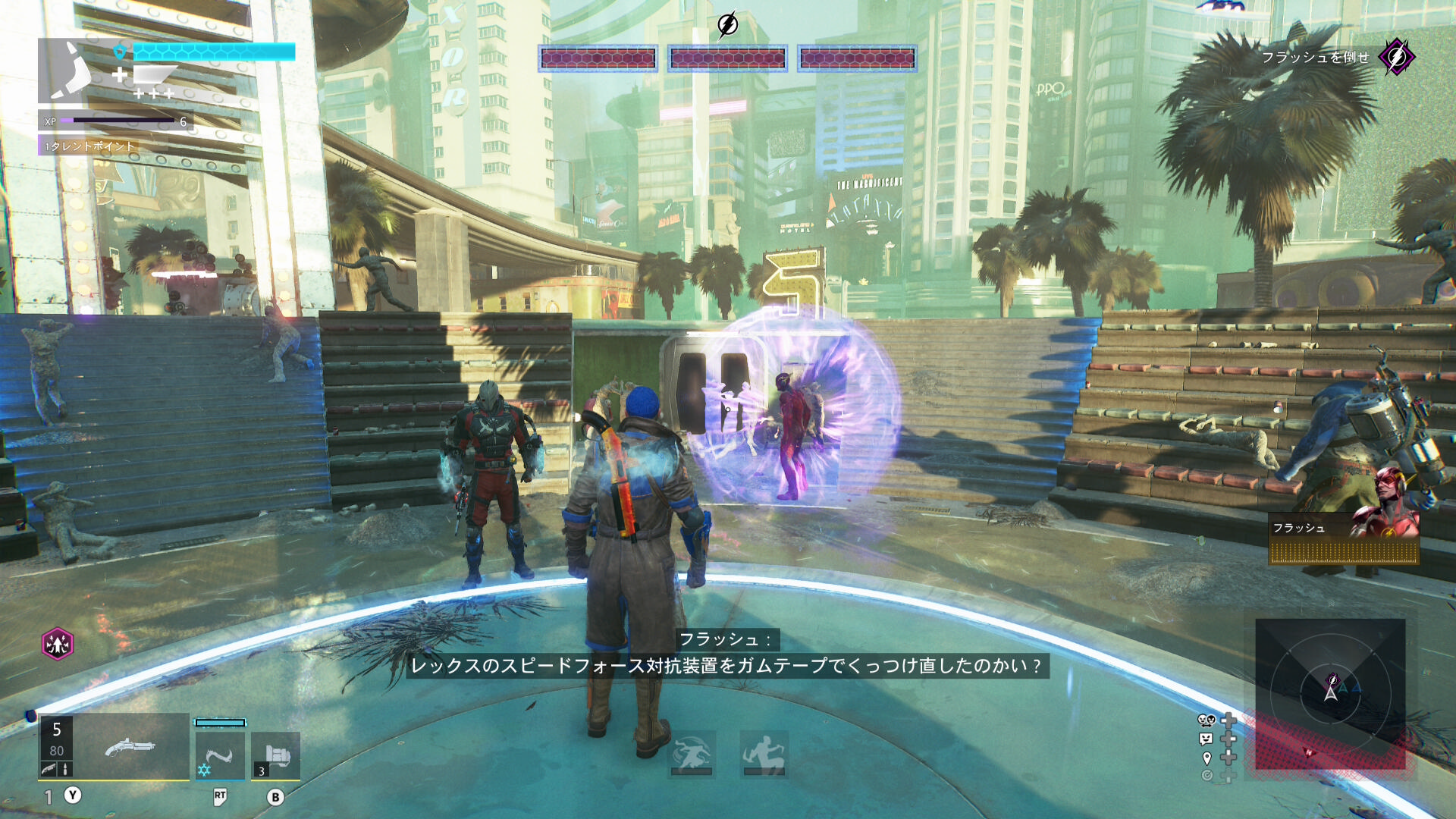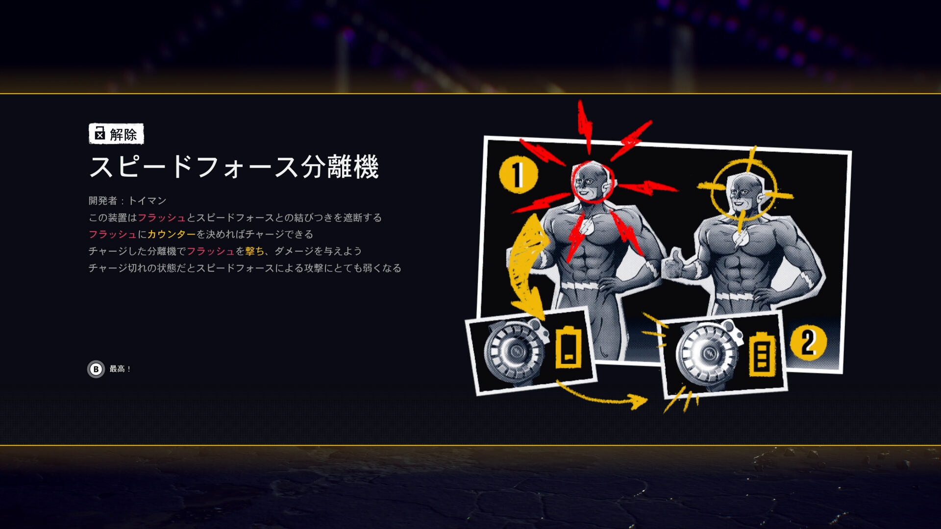 さっそくトイマンのミッションを片付けます。クリア後、スピードフォース分離機というものがアンロックされる。通常、フラッシュにはダメージが入らないけれど、この分離機があれば可能になるとか。