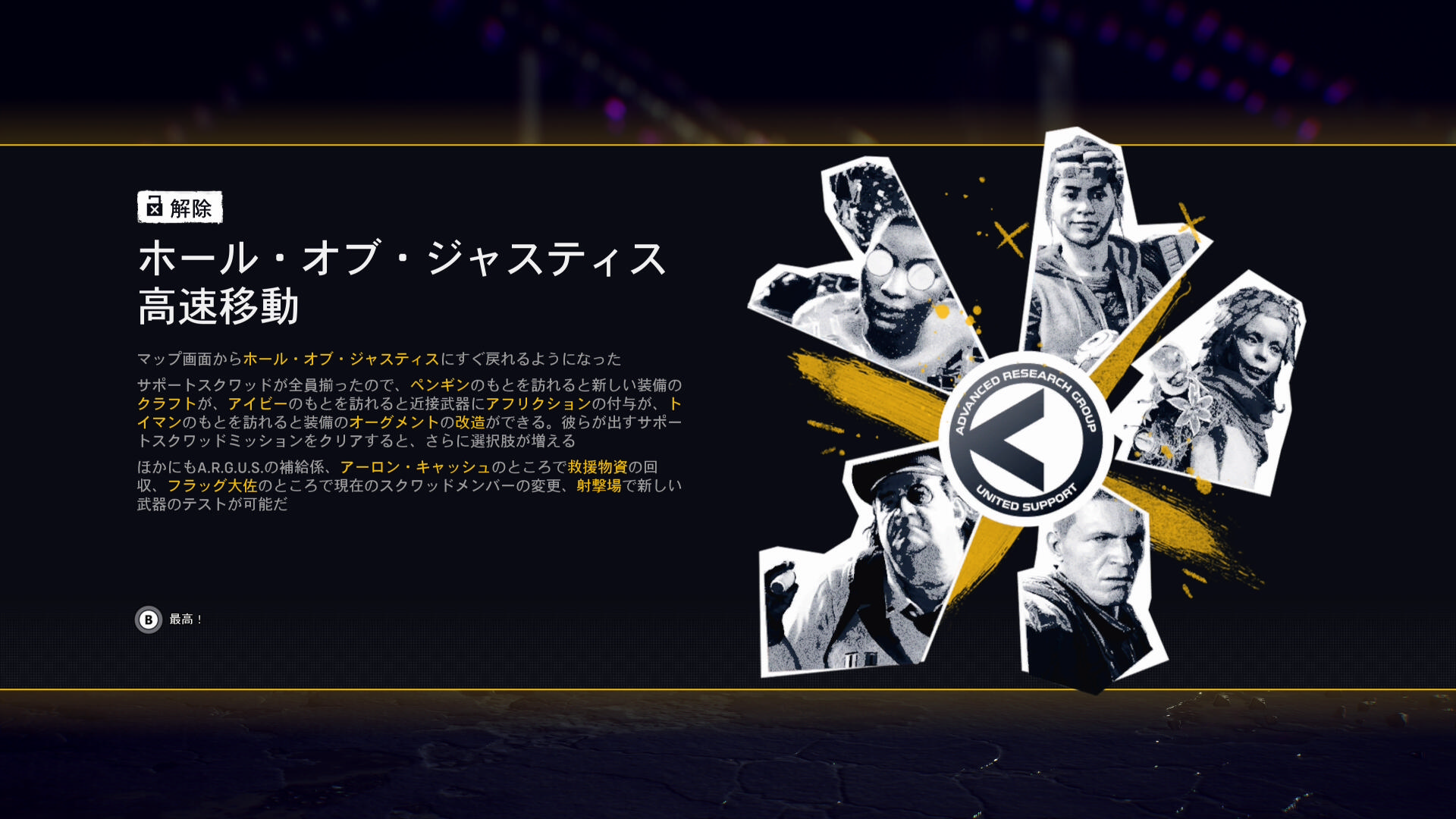 それからホール・オブ・ジャスティスにサポートメンバーが揃ってきました。彼らからサポートを受けるにはホール・オブ・ジャスティスに戻る必要があるのだけれど、ファストトラベルが可能になったことで戻るのがラクになります。