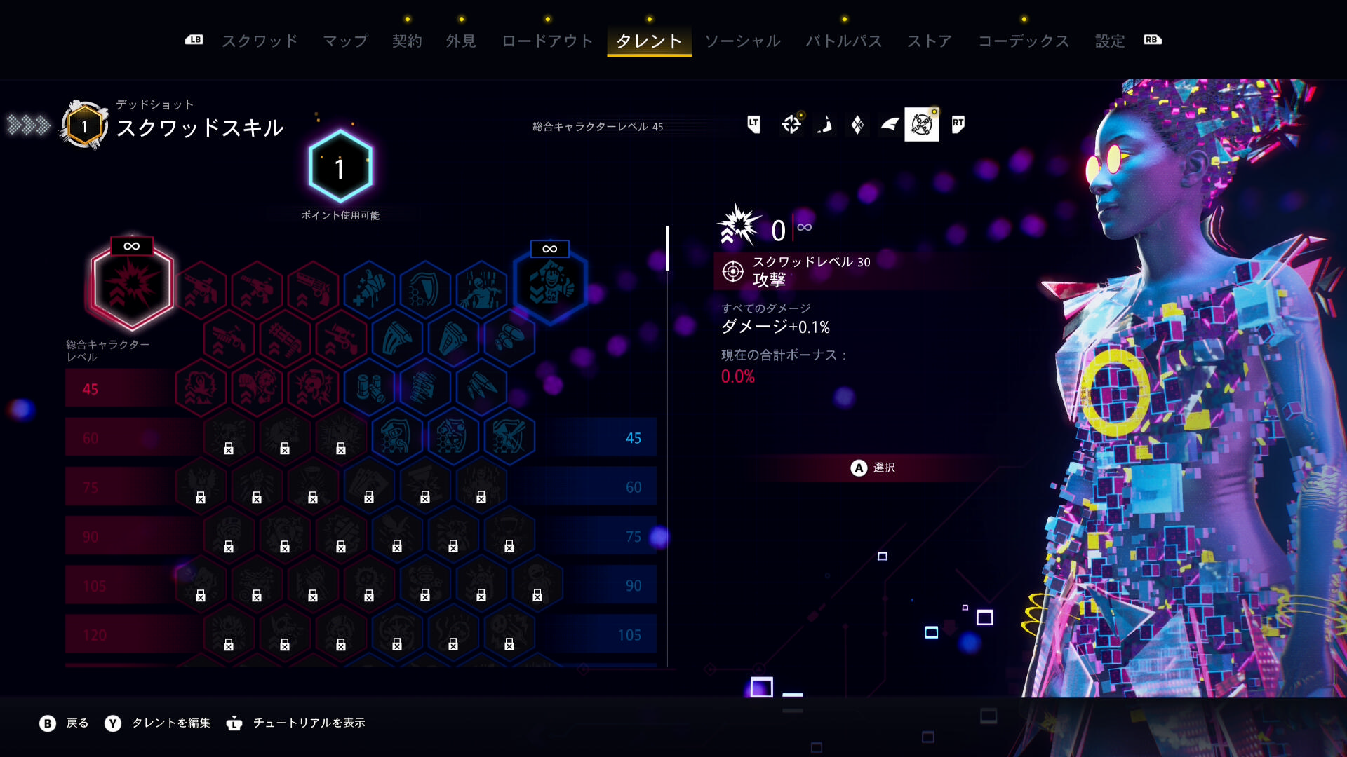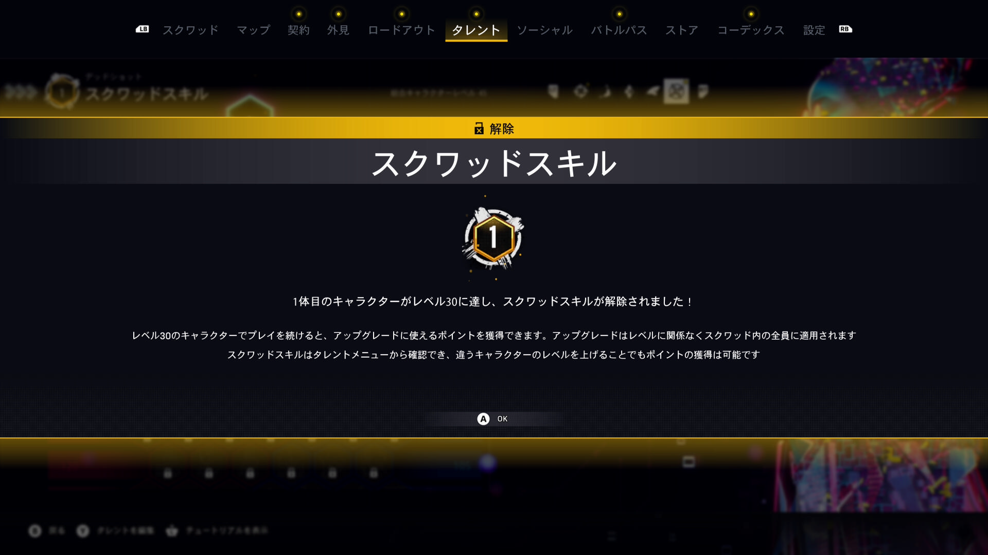 スクワッドスキルを上げるためのアップグレードポイントは『レベル30のキャラクターを使い続けること』らしい。当面は3人をレベル MAX にするのが優先されるのでスクワッドスキルは後回しとなります。