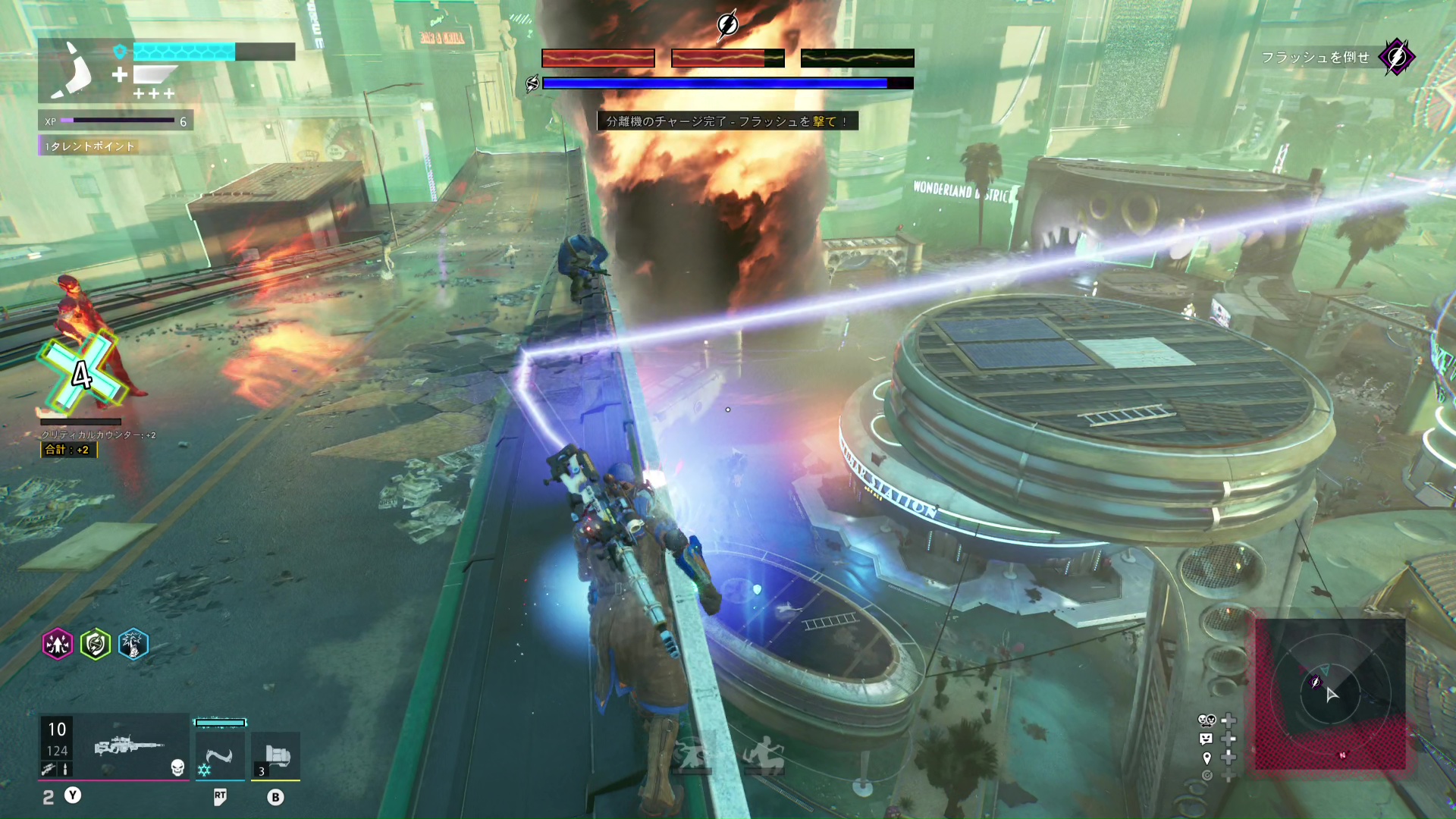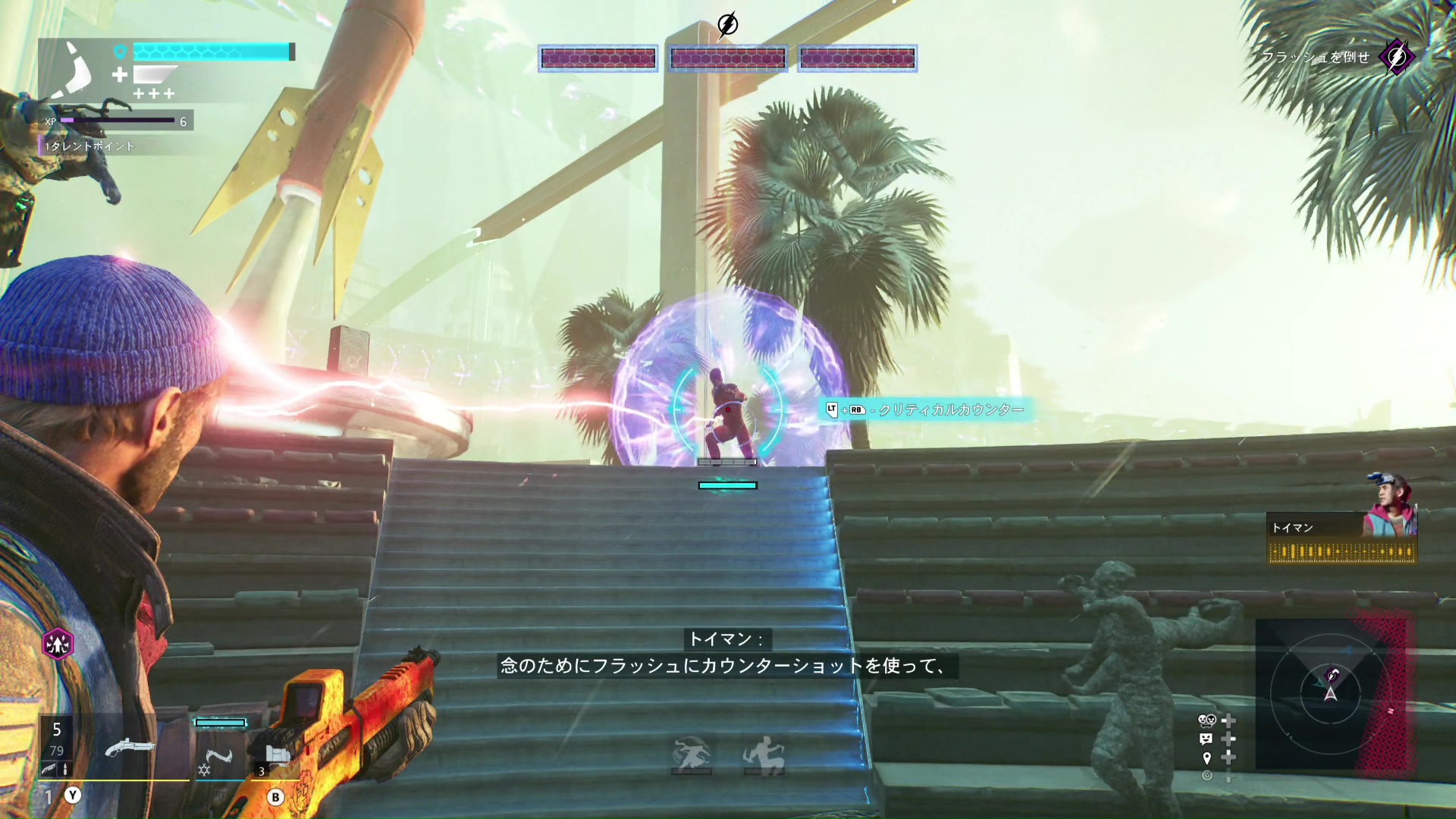 フラッシュはバリアを張っていて攻撃が通らないけれど、こちらにはスピードフォース分離機があります。まずはカウンターショットをお見舞いし、バリアを消すことからスタート。