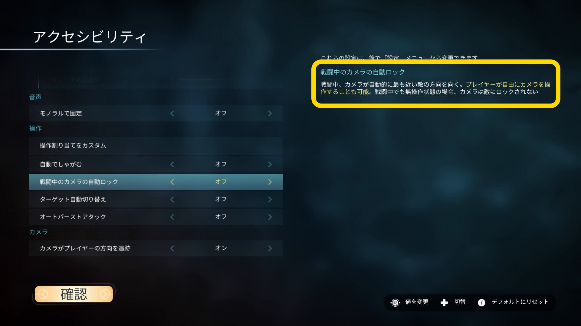 ”戦闘中のカメラの自動ロック” というのがあり、カメラが一番近い敵に自動的に向くとあるんですよ。これを ON にしてプレイしていたんですが、どうも機能していないっぽい。OFF/ON して確認してみたけど、ON にしてもカメラが自動で向くことはありませんでしたね。
