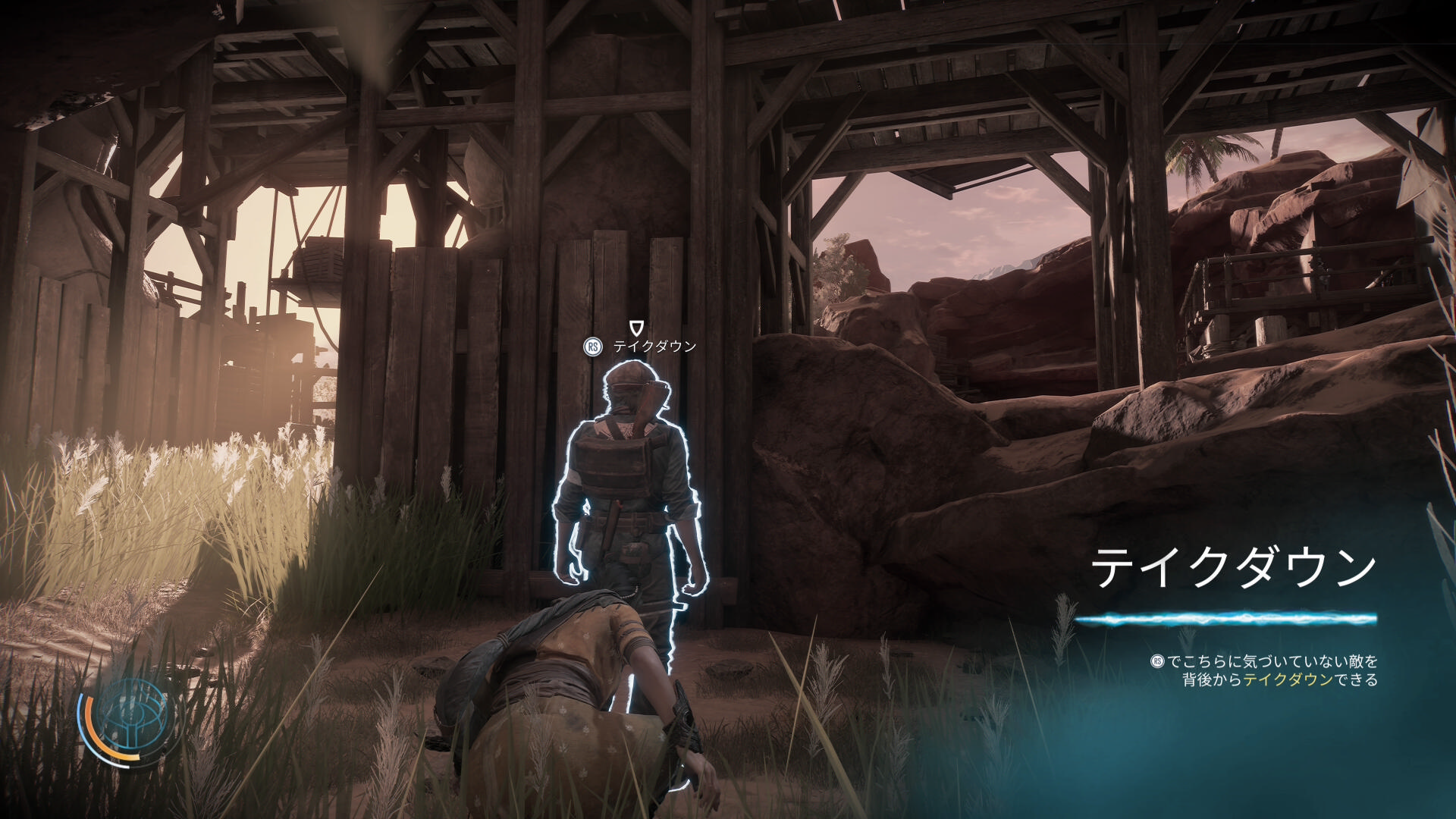 本作は基本的にステルス。ようやくテイクダウンが可能になって少しうれしい管理人です。近くにいる敵がテイクダウンに気づくことがある点はいただけないかなと。結局、戦闘になってしまう。