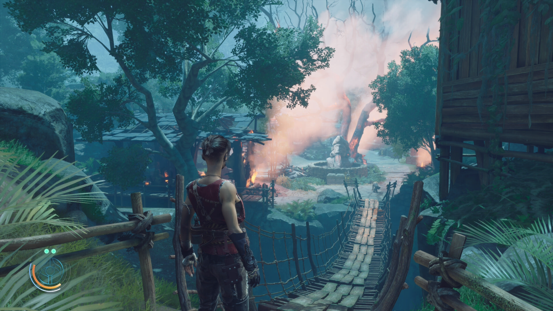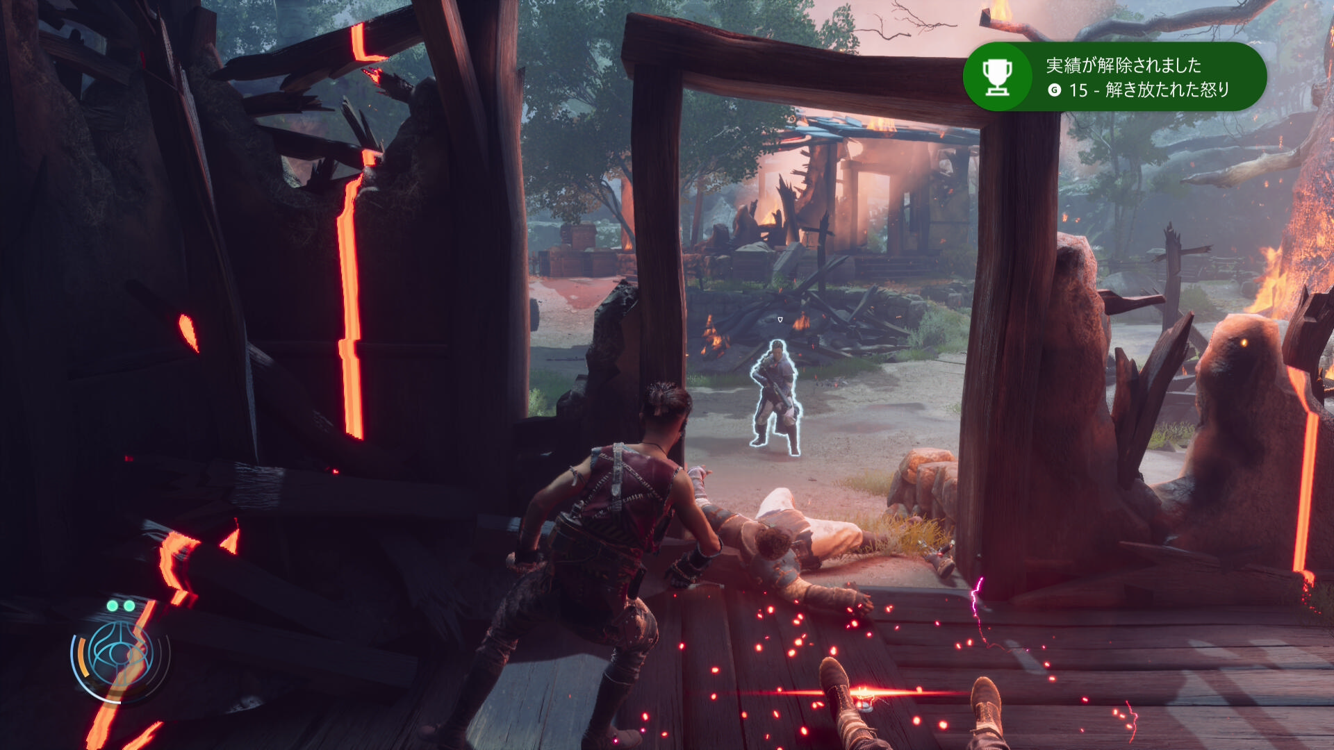 村の中心部に向かいますと燃やされている。侵略者系のやつらってなんでいつも火を放つんでしょうね。橋の先でアザドが膝をついてショックを受けています。
