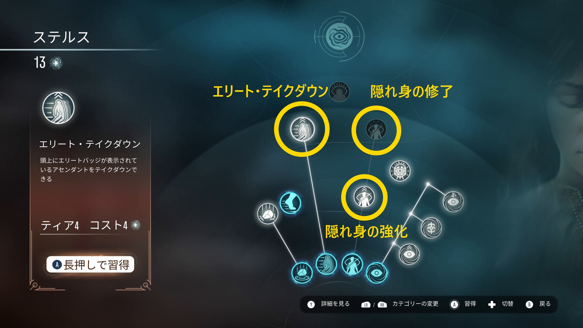 「隠れ身を使って」「エリート・アセンダントをテイクダウン」することを繰り返して2個の実績を解除しました。一緒に解除できるので捗りました。