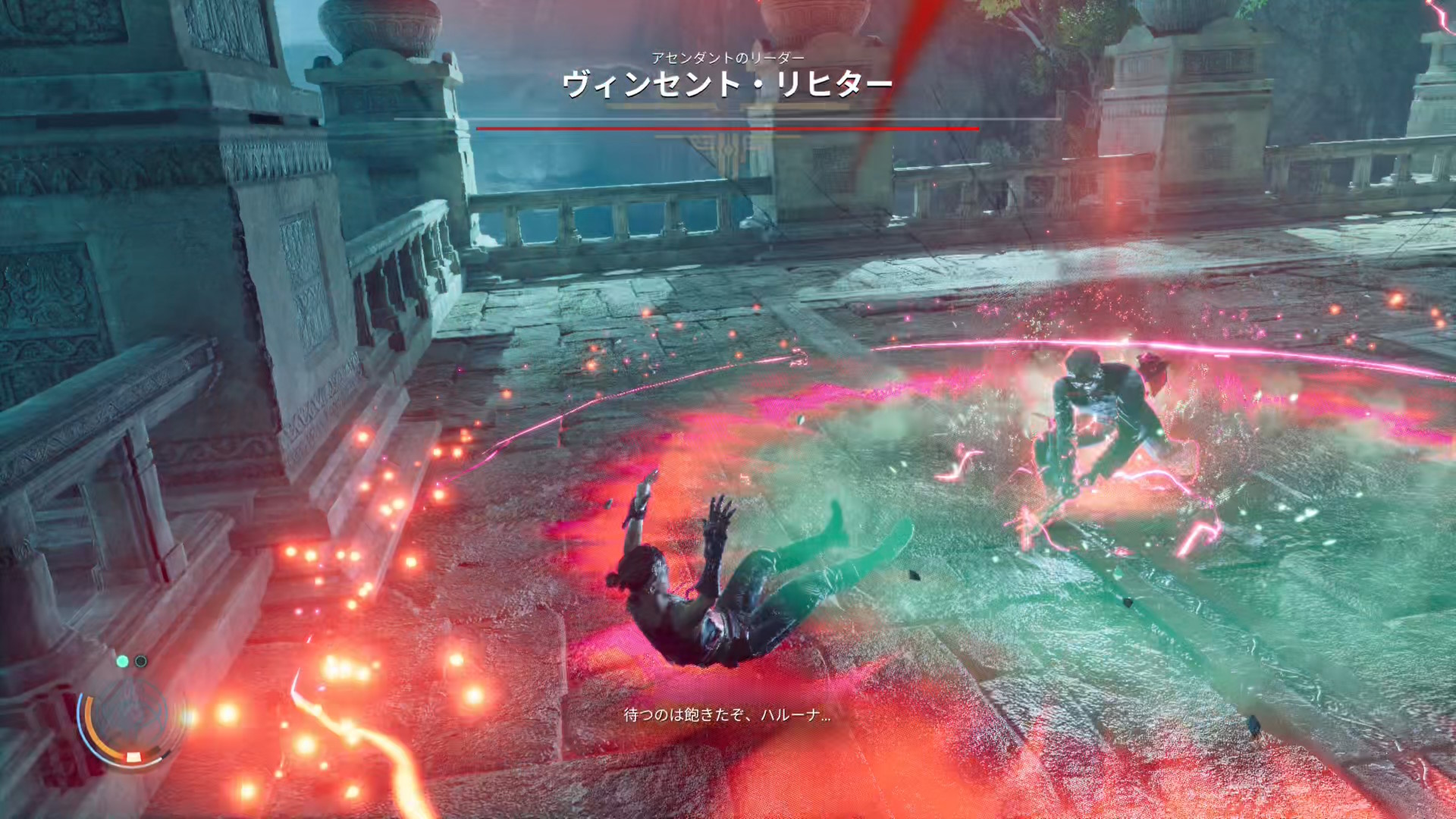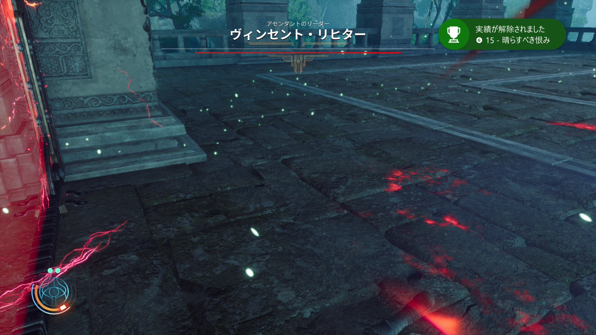 そして、ヴィンセントとのタイマン戦闘が開始されるのですが、開幕直後にポコン来ましてそっちに意識を奪われて初手が遅れて思っクソダメージを受ける。実績解除のタイミングおかしくない?